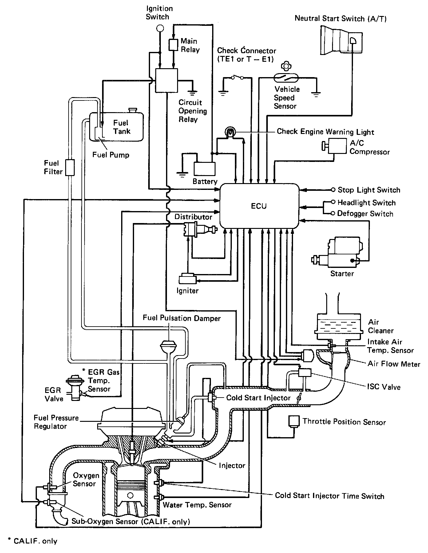 Fuel is supplied under constant pressure to the EFI injectors by an electric fuel pump. The injectors inject a metered quantity of fuel into the intake manifold in accordance with signals from the (ECU) (Electronic Control Unit).