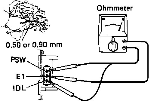 7. There should be continuity with a 0.50mm (0.020in.) feeler gauge inserted in the stop. There should be NO continuity with a 0.90mm (0.035in.) feeler gauge inserted in the stop.