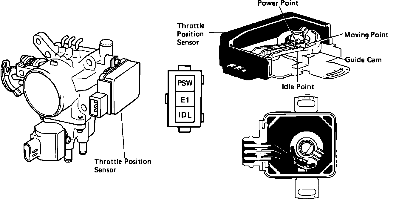 The TPS is mounted on the throttle valve body and sends a varying voltage signal to the ECU based on throttle valve position. The ECU can then adjust fuel delivery based on acceleration, deceleration, full throttle (WOT) or idle. The TPS inputs the ECU through terminal PSW.