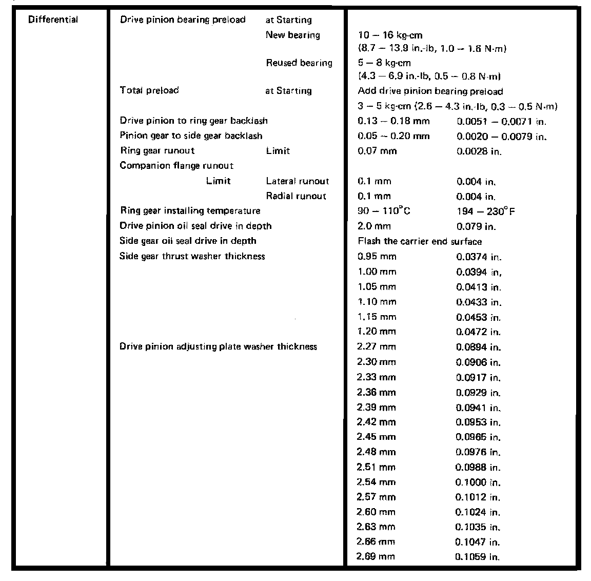 Rear Differential, Preload/Side Gear Thickness: