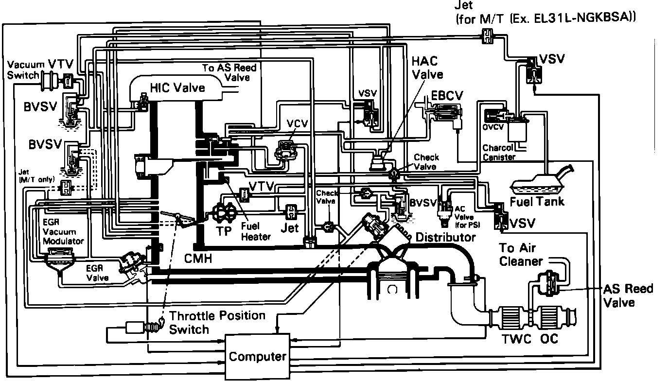 Toyota carbureted models utilize a Feedback Control System to control fuel delivery and carburetor operation during a variety of driving situations. The Electronic Control Unit (ECU) receives signals from the Oxygen Sensor, distributor and various other sensors, and monitors air/fuel mixture by means of an Electronic Air Bleed Control Valve (EBCV). This process reduces exhaust emissions in addition to providing improved driveability and fuel economy. California models are equipped with a self-diagnostic function built into the ECU.