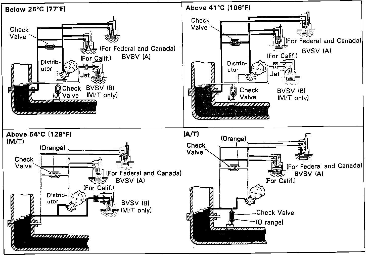 The inner vacuum advance port receives manifold vacuum when coolant temperatures are below 77°F (25°C) and above 106°F (41°C).