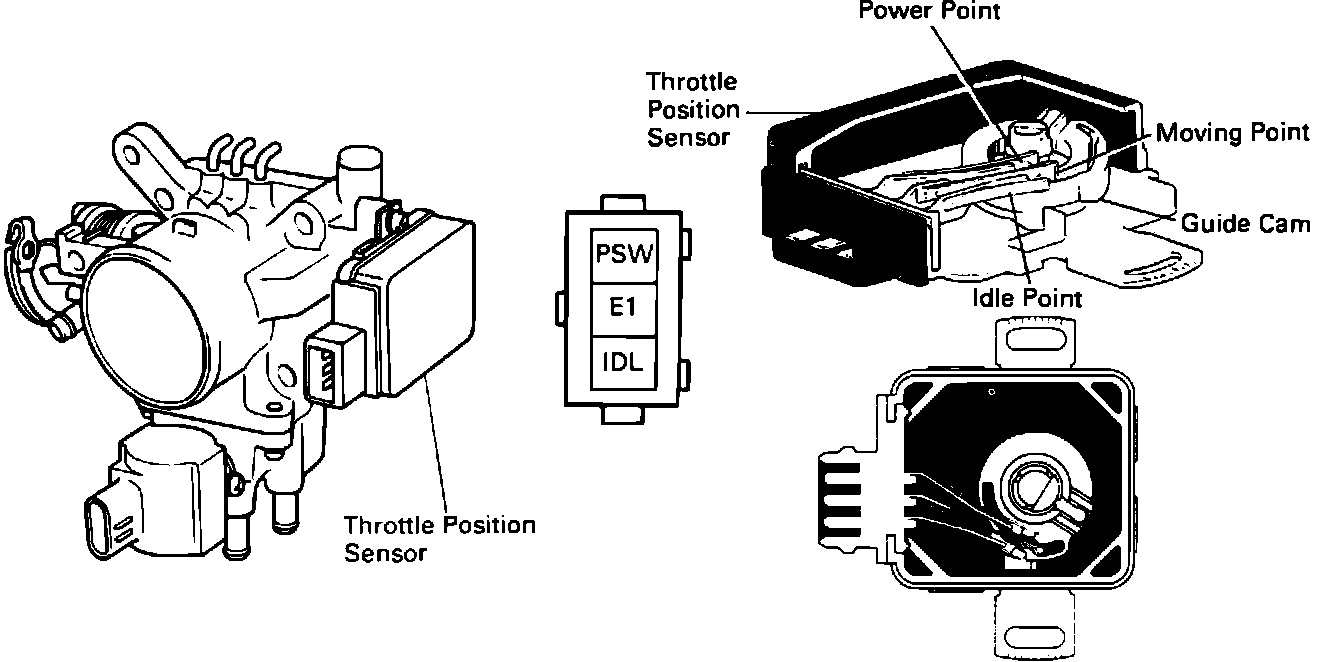 The TPS is mounted on the throttle valve body and sends a varying voltage signal to the ECU based on throttle valve position. The ECU can then adjust fuel delivery based on acceleration, deceleration, full throttle (WOT) or idle. The TPS inputs the ECU through terminal PSW, (on models w/o Electronic Controlled Transaxle), or terminal VTA, (on models with Electronic Controlled Transaxle).