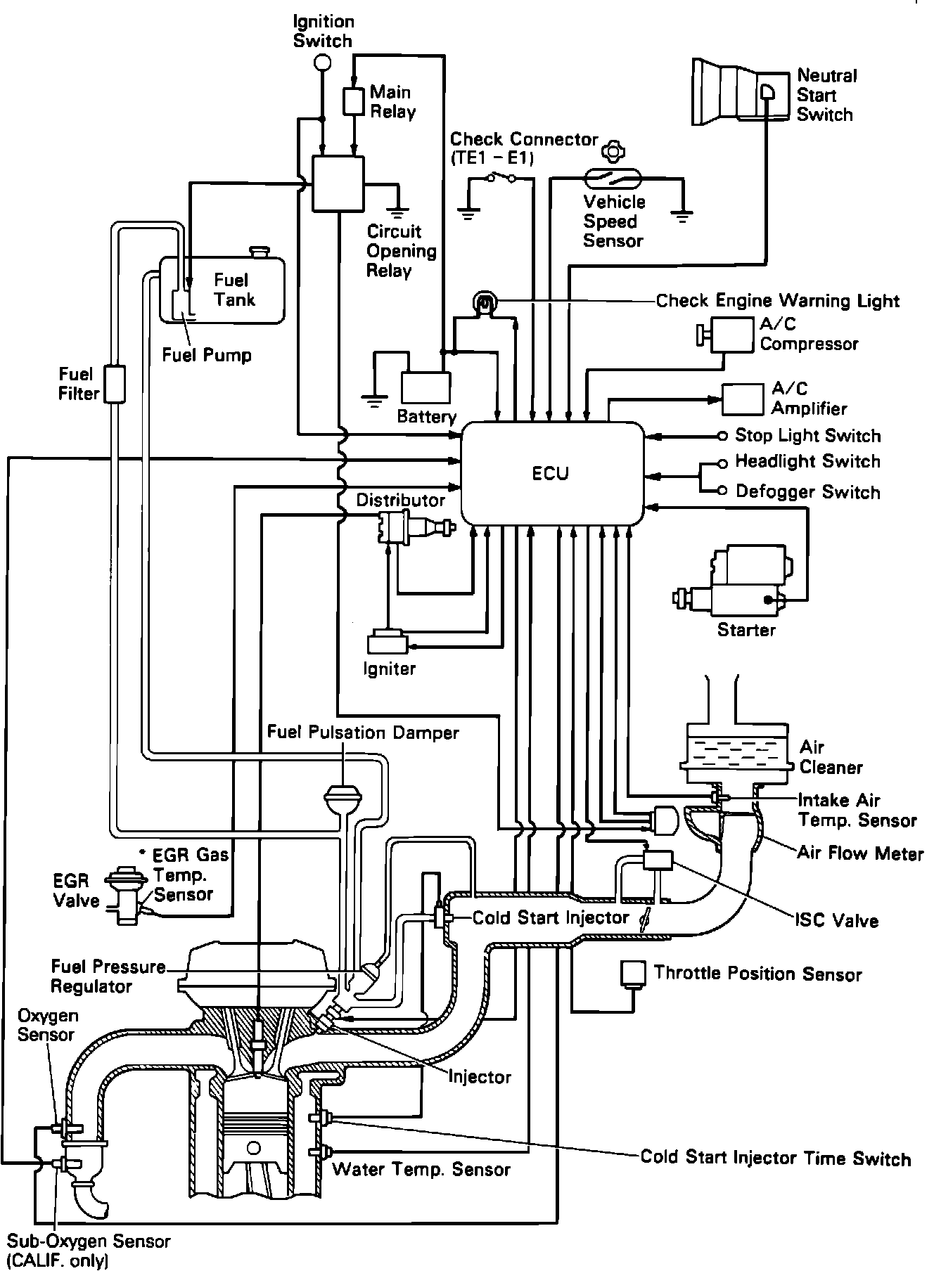 The Toyota Computer Control System (TCCS) is the central control for electronic fuel injection (EFI), electronic spark advance (ESA), idle speed control (ISC) and exhaust gas recirculation (EGR). The electronic control unit (ECU) monitors engine intake air volume, intake air temperature, coolant temperature, engine rpm and exhaust oxygen content, and regulates engine operation. The TCCS has a self-diagnostic function that helps find malfunctions or abnormalities in the system.