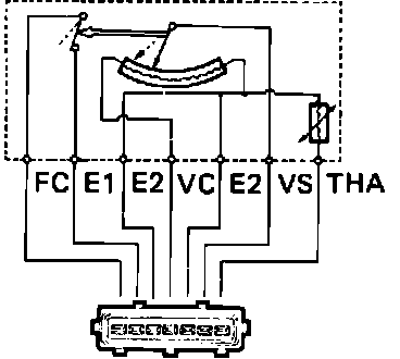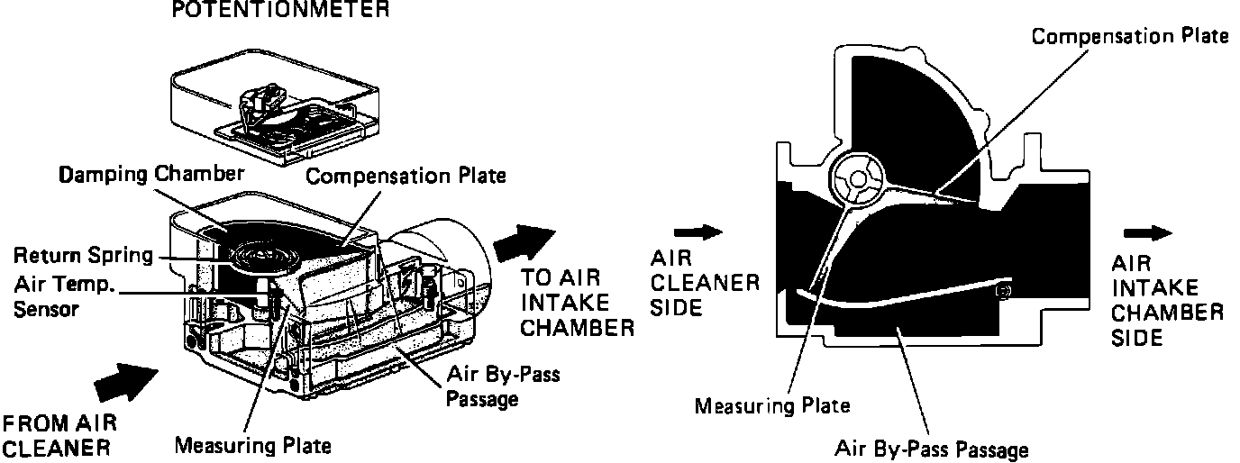 A Bosch vane type airflow meter is mounted in the air induction system near the air cleaner. The airflow meter measures intake air volume, and converts these readings into voltage signals by means of a variable resistor (potentiometer). These voltage signals are then sent to the ECU and used to determine injection duration and proper fuel delivery. When intake air volume is low, the voltage is high; when the intake air volume is high, the voltage signal is approximately zero.