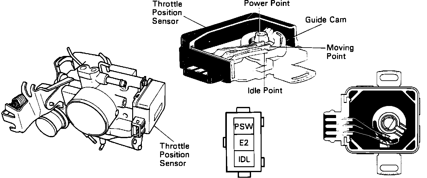 The TPS is mounted on the throttle valve body and sends a varying voltage signal to the ECU based on throttle valve position. The ECU can then adjust fuel delivery based on acceleration, deceleration, full throttle (WOT) or idle. The TPS inputs the ECU through terminal PSW.