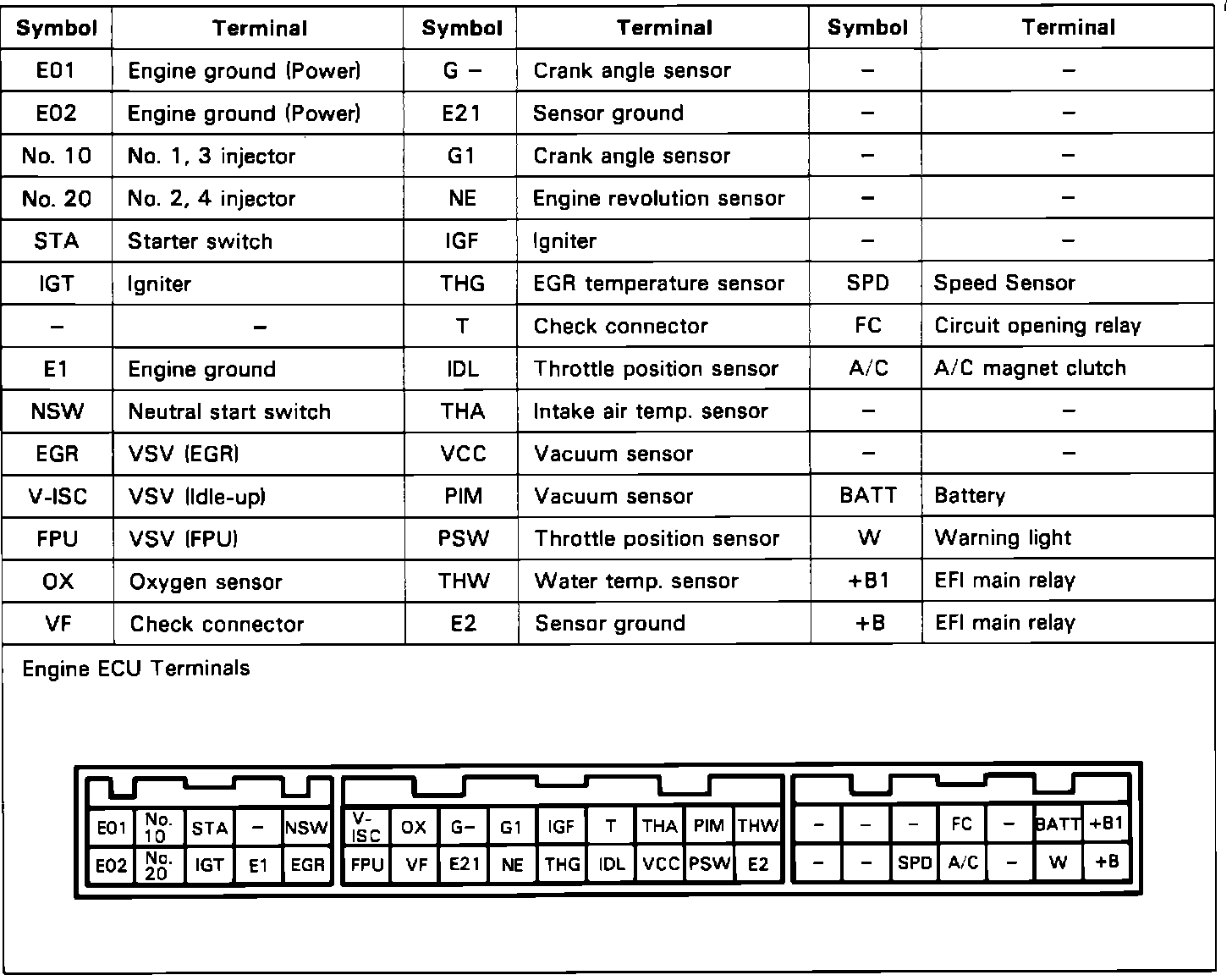 4. If voltage was present in step #3, inspect wiring and connection between ECU terminal E1 and body ground. If wiring and connection were not at fault replace ECU.