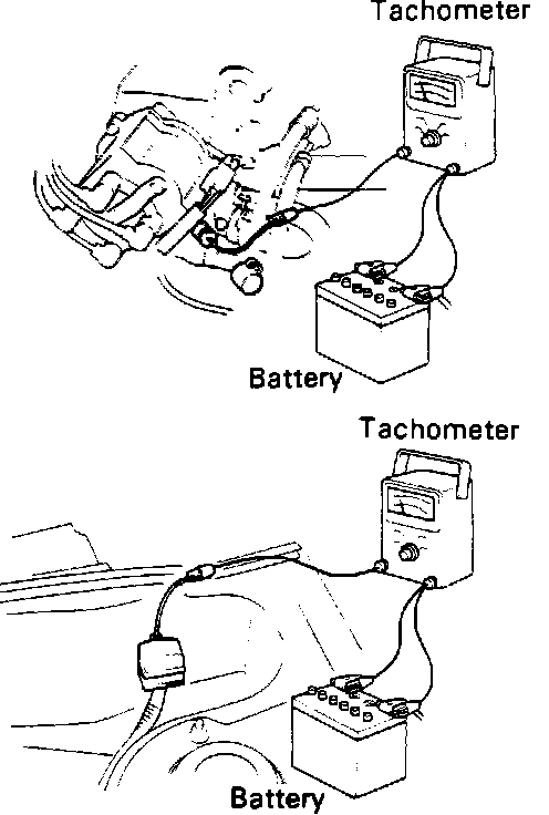 2. Connect a tachometer test probe to the distributor terminal service connector or the IG terminal of the check connector. Fig. 91