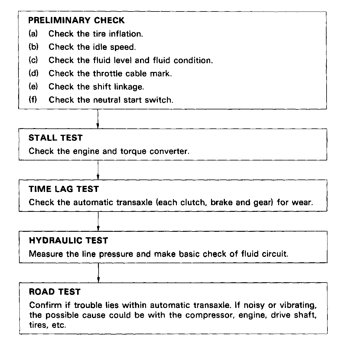 1. Troubles occuring with the automatic transaxle can be caused by either the engine or the transaxle itself. These two areas should be distinctly isolated before proceeding with troubleshooting.2. Troubleshooting should begin with the simpliest operation, working up in order of difficulty. but first determine whether the trouble lies within the engine or transaxle.