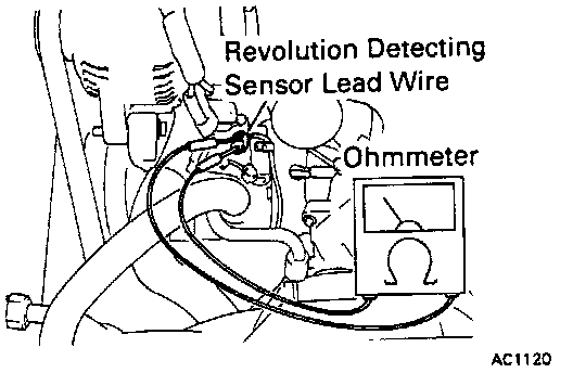 1. Unplug electrical connector to revolution sensor and measure resistance across sensor terminals.