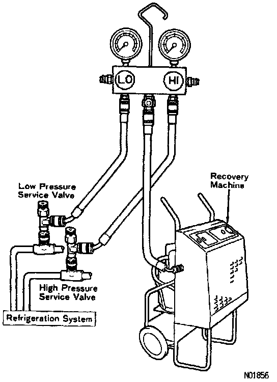 When discharging refrigerant from the system as follows, use a recovery machine to recover the refrigerant.