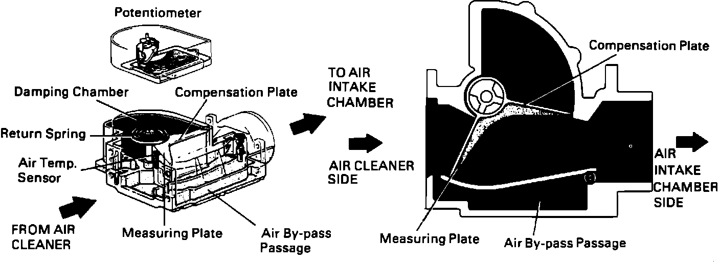 A Bosch vane type airflow meter is mounted in the air induction system near the air cleaner. The airflow meter measures intake air volume, and converts these readings into voltage signals by means of a variable resistor (potentiometer). These voltage signals are then sent to the ECU and used to determine injection duration and proper fuel delivery. When intake air volume is low, the voltage is high; when the intake air volume is high, the voltage signal is approximately zero.