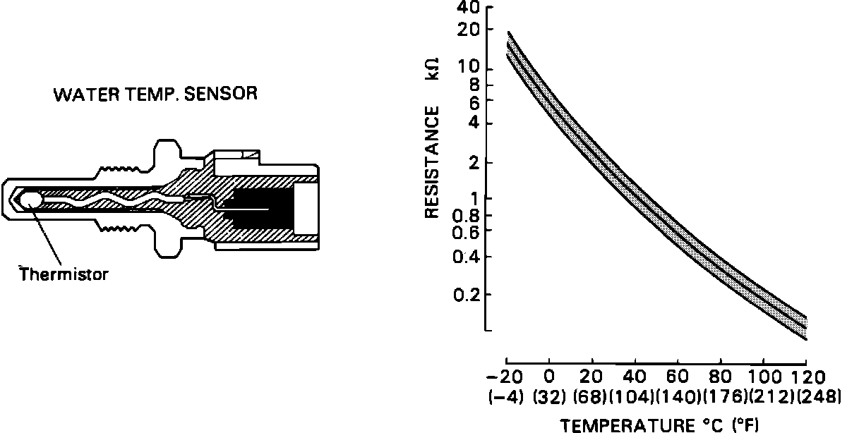 The Coolant Temperature Sensor, located on the top, rear of the engine, monitors coolant temperature with a thermistor whose resistance varies according to engine temperature. The ECU uses this signal to control open/closed loop operation of the fuel injection system, overdrive on electronic transaxles, spark advance (ESA), idle speed control system and EGR system. The THW inputs the ECU through terminal THW.