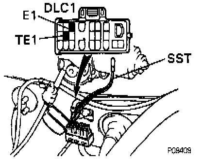 - Using SST 09843-18020 or equivalent, connect terminals TE1 and E1 of the DLC1.