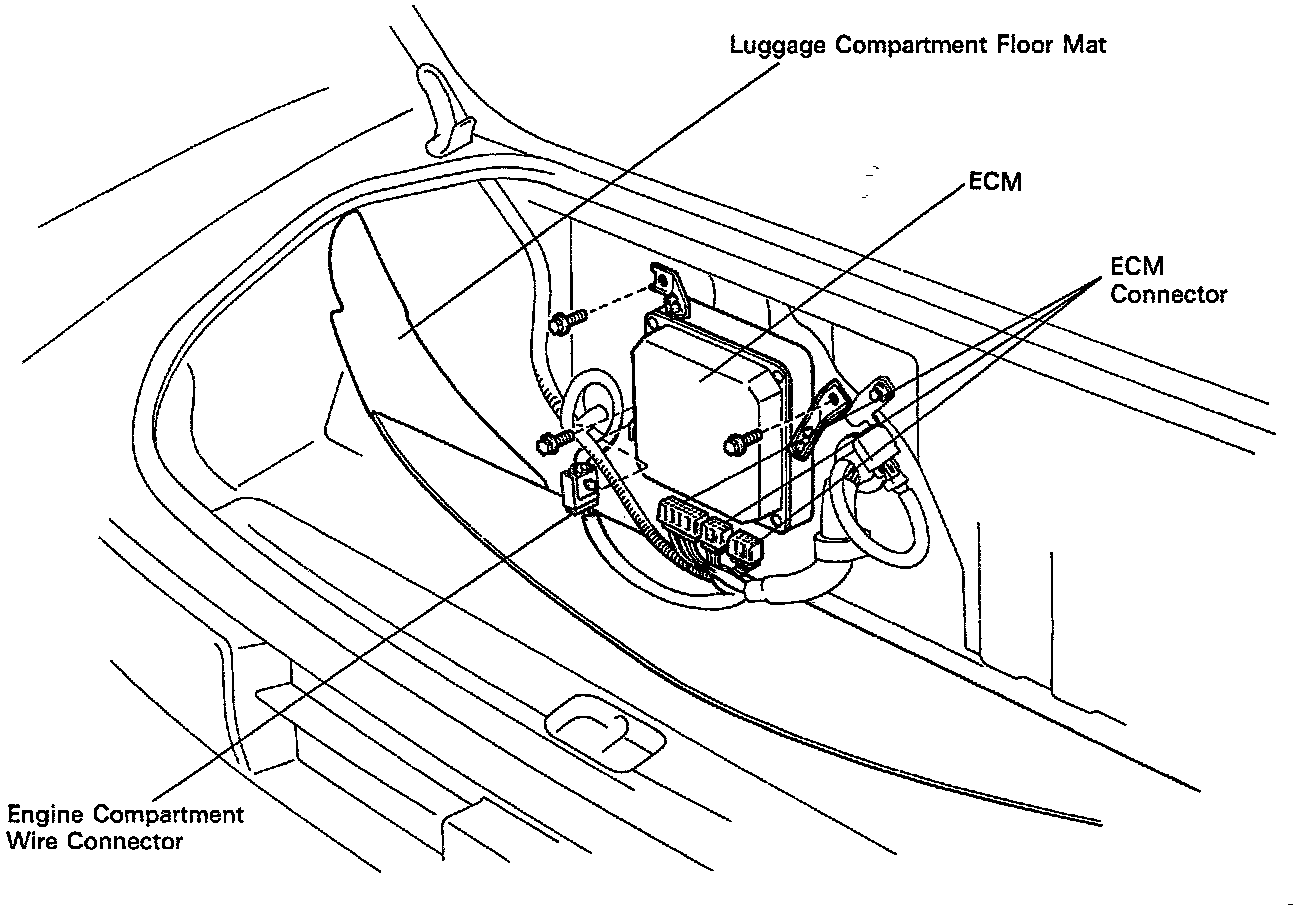 1. TO ACCESS THE ECM, DISCONNECT FRONT SIDE OF LUGGAGE COMPARTMENT FLOOR MAT FROM PARTITION PANEL.