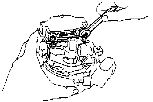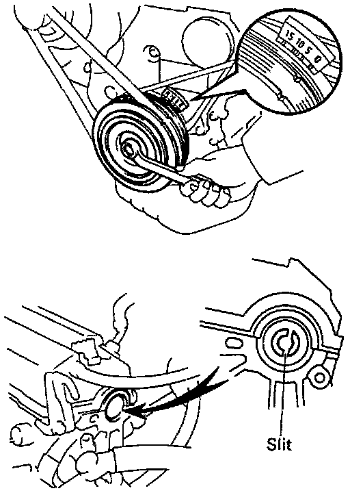 - Turn the crankshaft clockwise, and position the slit of the intake camshaft as shown in the illustration.