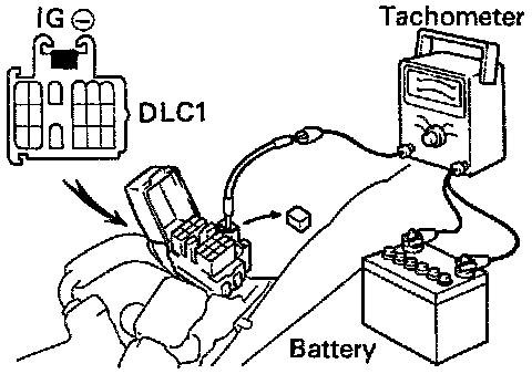 - Connect the tester probe of a tachometer to terminal IG(-) of the DLC1.