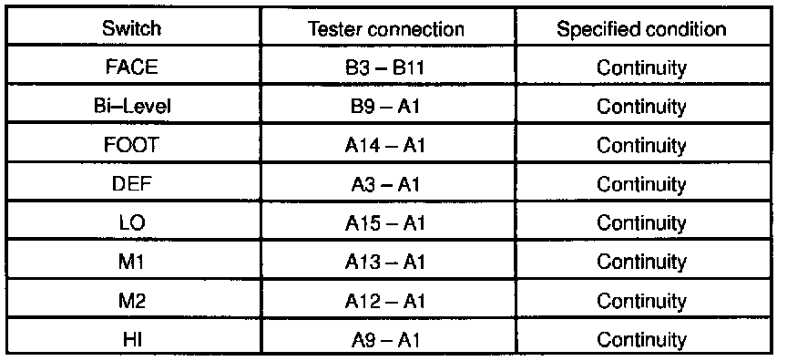 b. Gradually turn the temperature control dial from "WARM" side to "COO" side and check the resistance between terminals B-4 and B-5 increase from 0 to approx. 3.0 k Ohms.