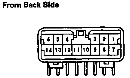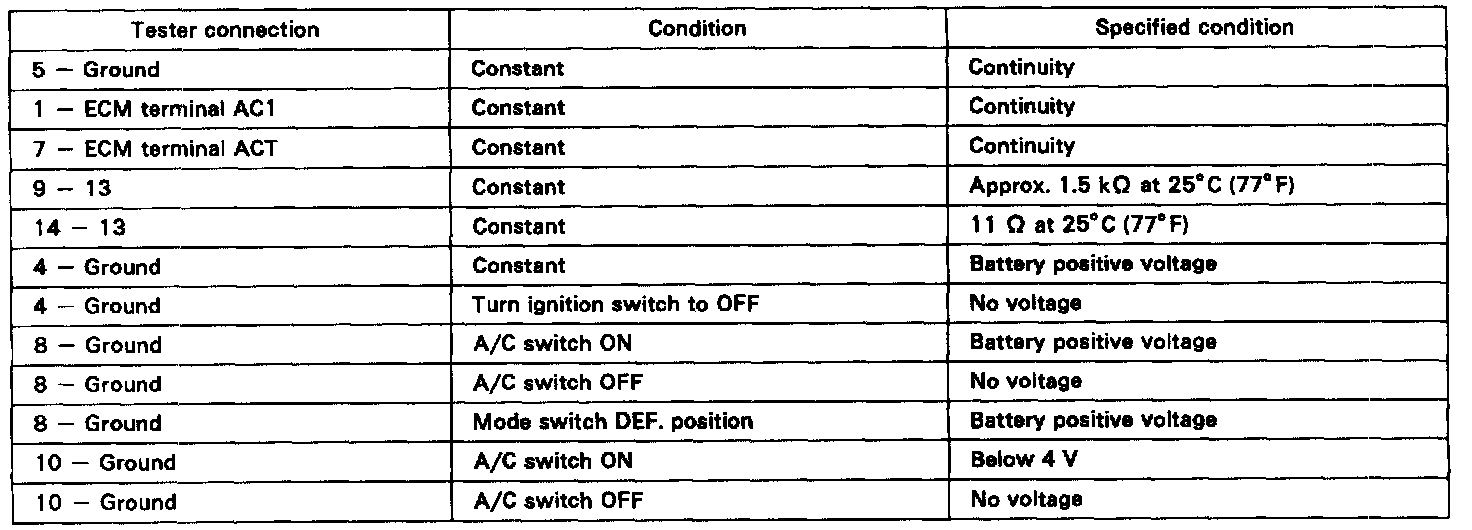 2. Connect the connector to A/C amplifier and inspect wire harness side connector from the back side, as shown in the chart.