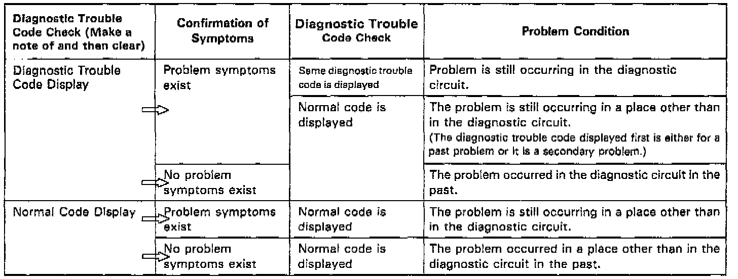 In the Diagnostic Trouble Code Check, it is very important to determine whether the problem indicated by the diagnostic trouble code is still occurring or occurred in the past but returned to normal at present. In addition, it must be checked in the problem symptom check whether the malfunction indicated by the diagnostic trouble code is directly related to the problem symptom or not. For this reason, the diagnostic trouble codes should be checked before and after the symptom confirmation to determine the current conditions, as shown in the table above. If this is not done, it may depending on the case, result in unnecessary troubleshooting for normally operating systems, thus making it more difficult to locate the problem, or in repairs not pertinent to the problem. Therefore, always follow the procedure in correct order and perform the diagnostic trouble code check.