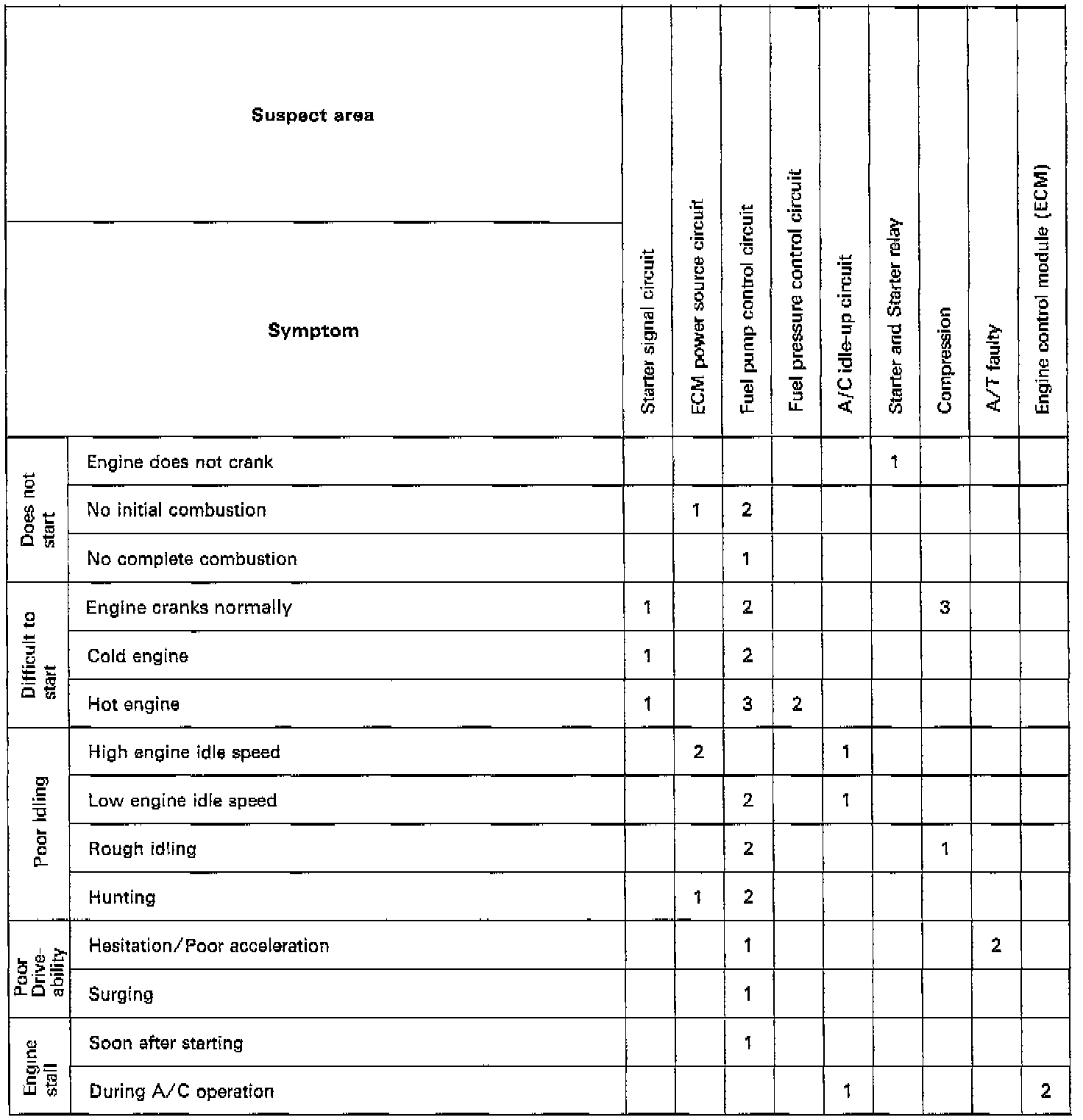 When the malfunction code is not confirmed in the diagnostic trouble code check and the problem still can not be confirmed in the basic inspection, then proceed to this step and perform troubleshooting according to the numbered order given in the table below.