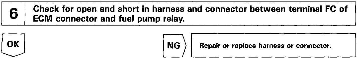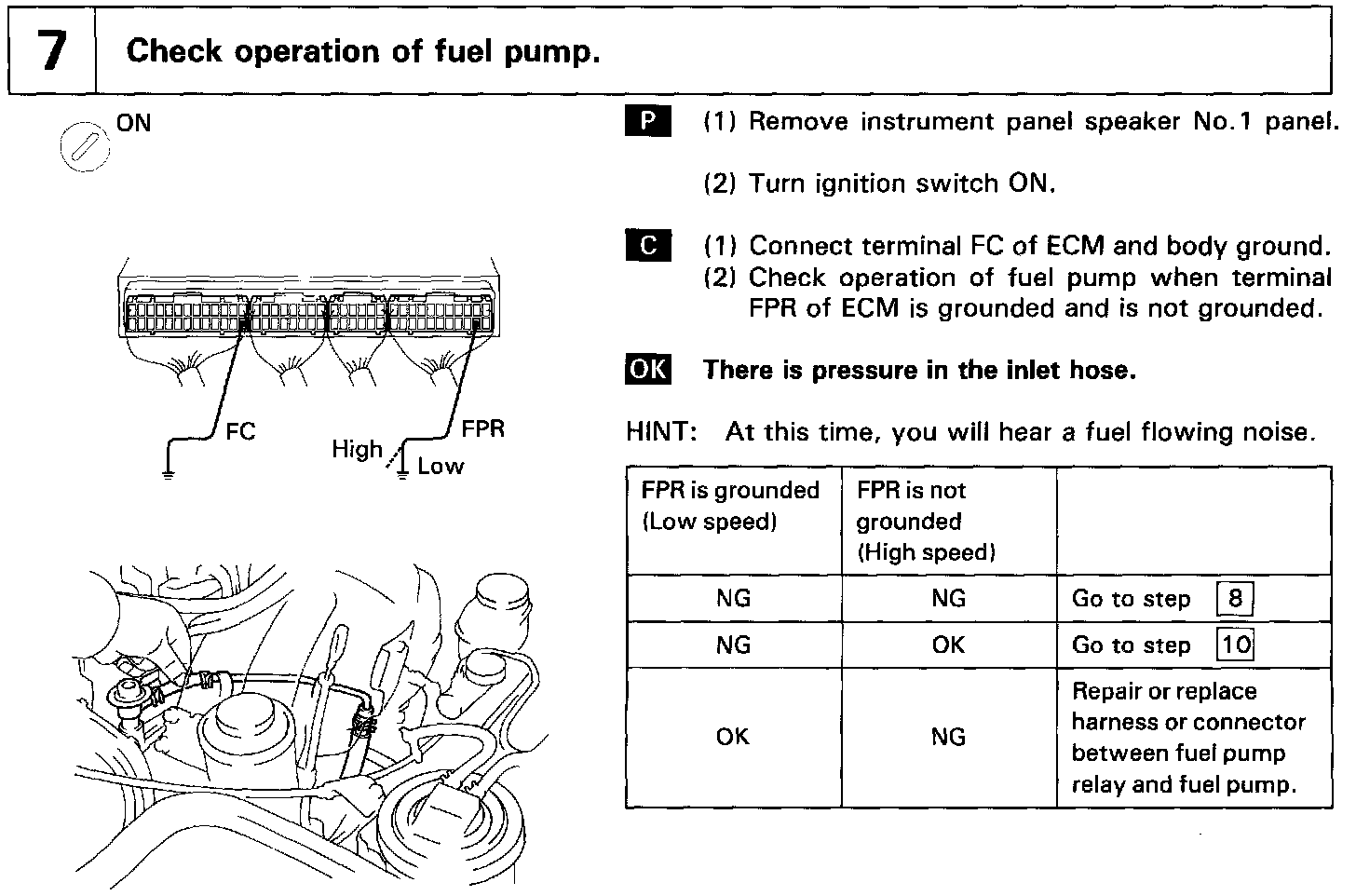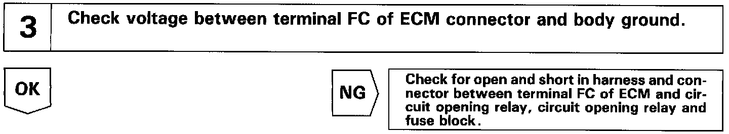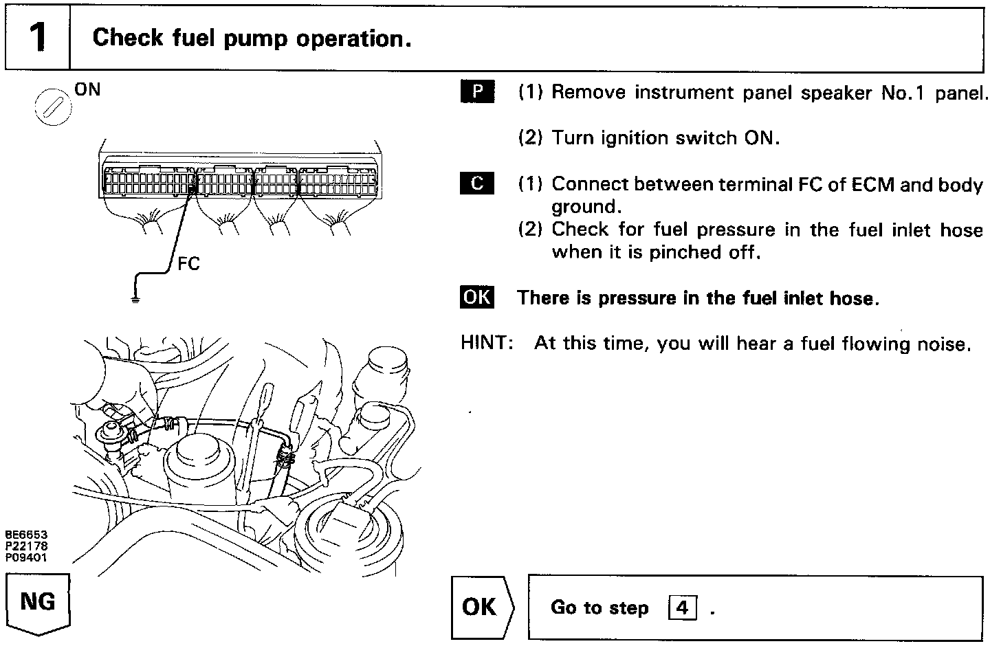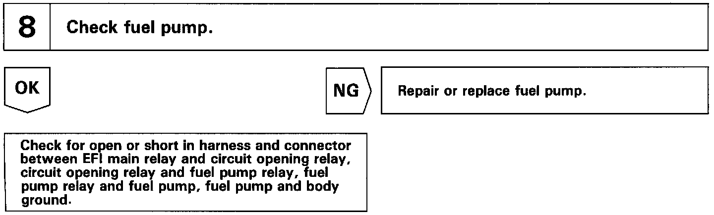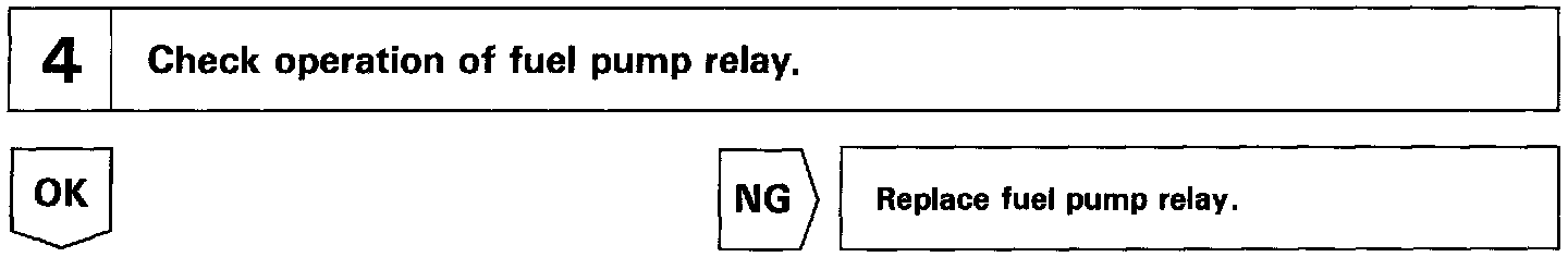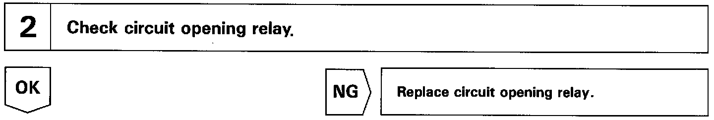 When the STA signal and NE signal are input to the ECM, Tr1 is turned ON, current flows to coil of the circuit opening relay, the relay switches on, power is supplied to the fuel pump and the fuel pump operates. While the NE signal is generated (engine running), the ECM keeps Tr1 ON (circuit opening relay ON) and the fuel pump also keeps operating.