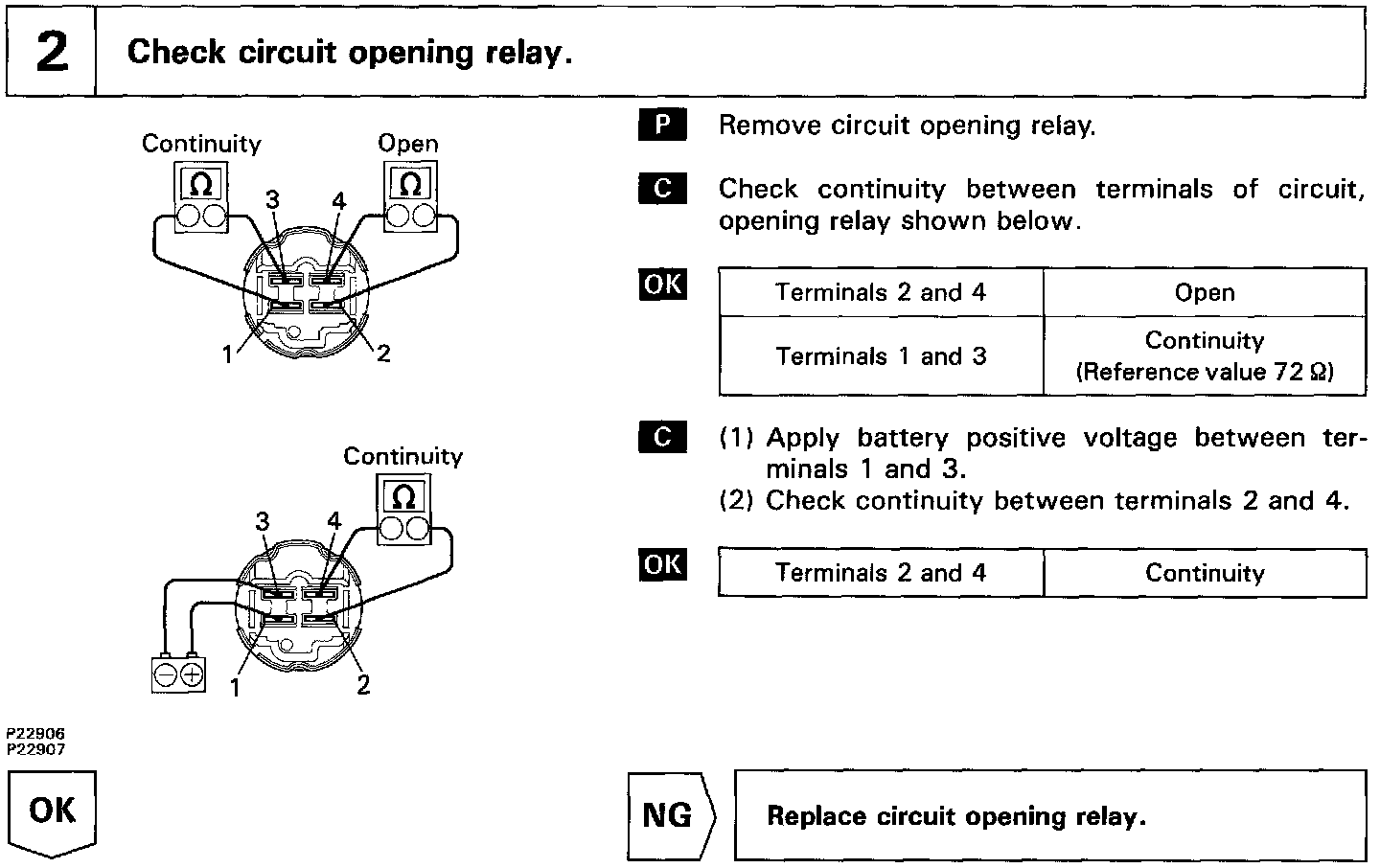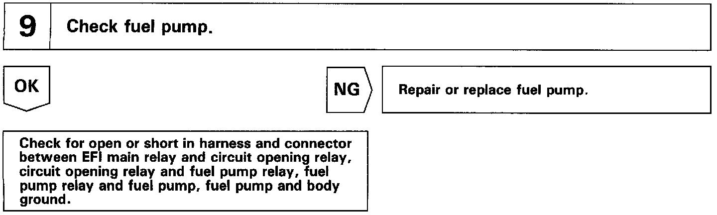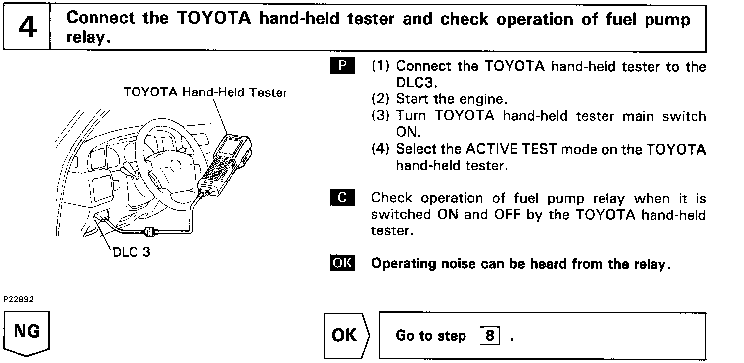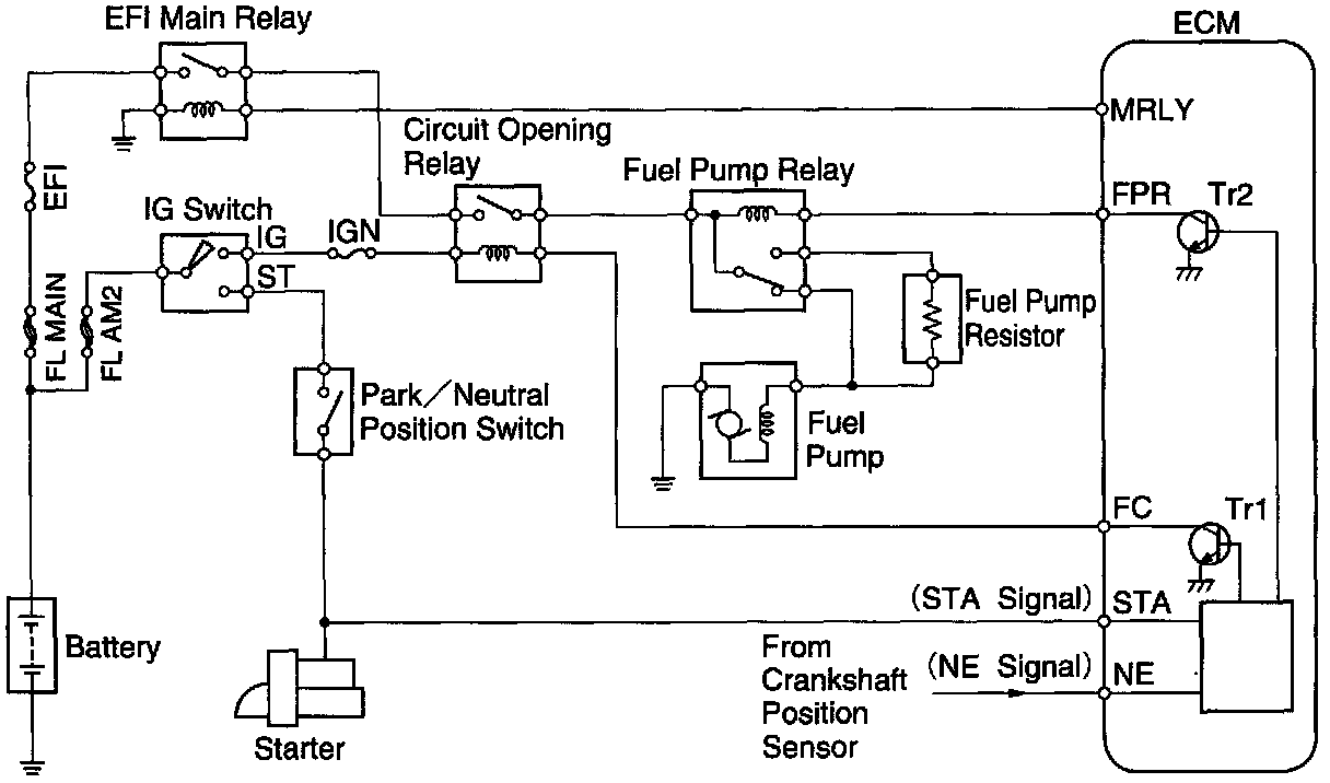 When the STA signal and NE signal are input to the ECM, Tr1 is turned ON, current flows to coil of the circuit opening relay, the relay switches on, power is supplied to the fuel pump and the fuel pump operates. While the NE signal is generated (engine running), the ECM keeps Tr1 ON (circuit opening relay ON) and the fuel pump also keeps operating.