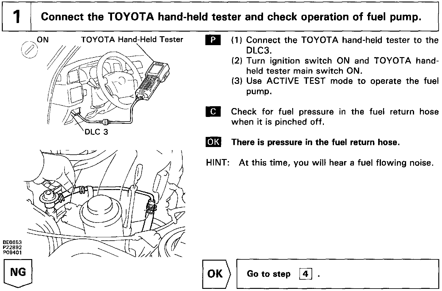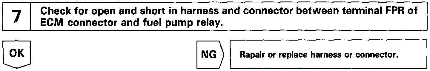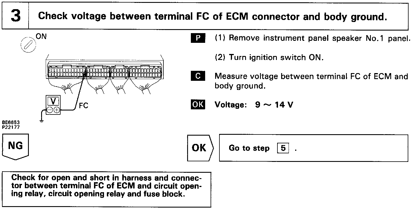 When the STA signal and NE signal are input to the ECM, Tr1 is turned ON, current flows to coil of the circuit opening relay, the relay switches on, power is supplied to the fuel pump and the fuel pump operates. While the NE signal is generated (engine running), the ECM keeps Tr1 ON (circuit opening relay ON) and the fuel pump also keeps operating.