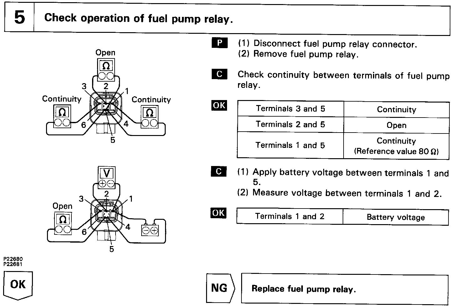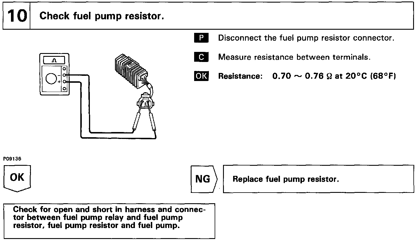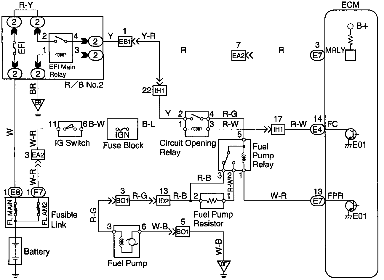 After the engine starts, during idling or light loads, since Tr2 goes ON, power is supplied to the fuel pump via the fuel pump resistor.