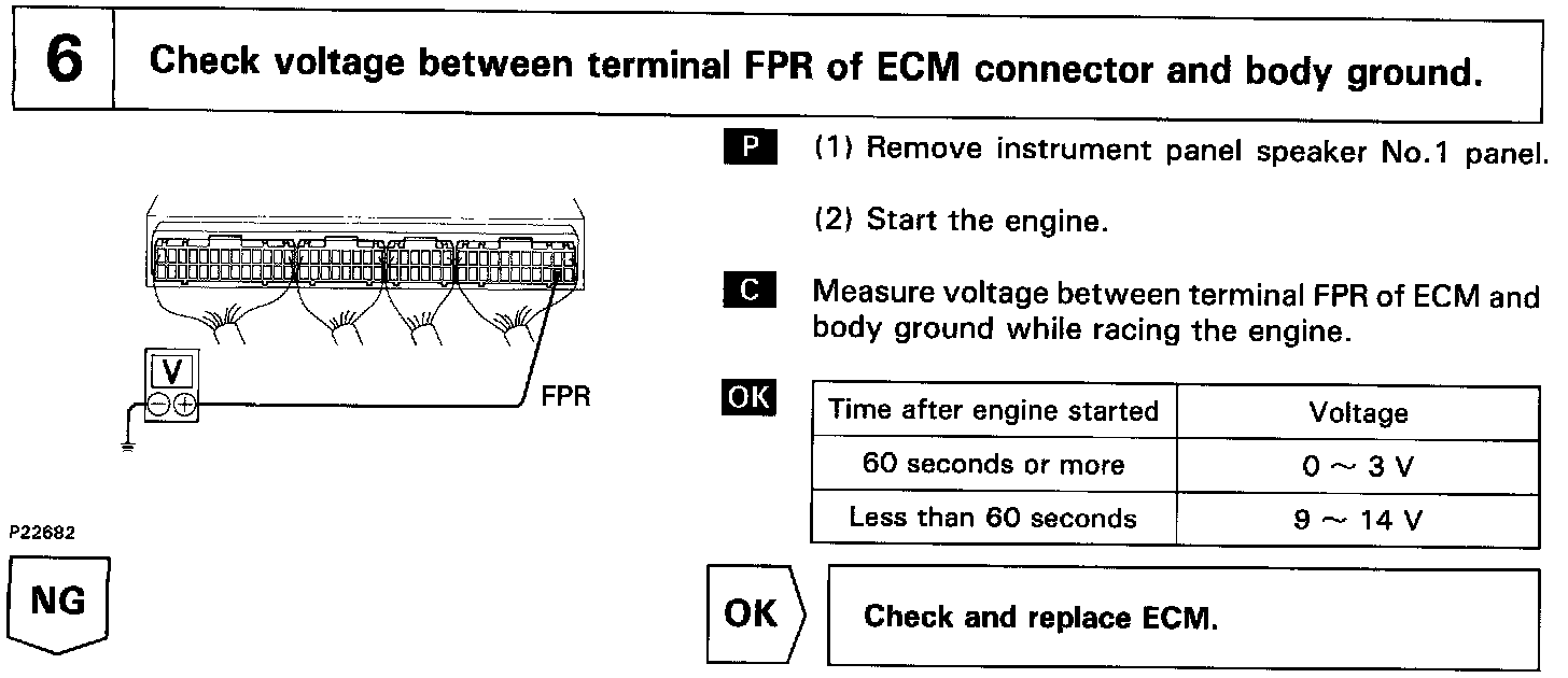The fuel pump speed is controlled at two levels (high speed or low speed) by the condition of the engine (starting, light load, heavy load). When the engine starts (STA ON), Tr2 in the ECM is OFF, so battery voltage is applied directly to the fuel pump. Fuel pump operates at high speed.