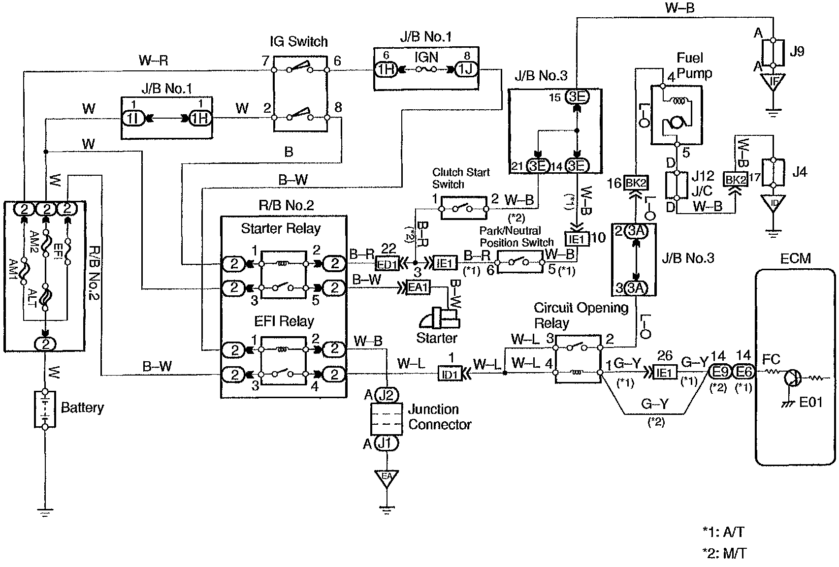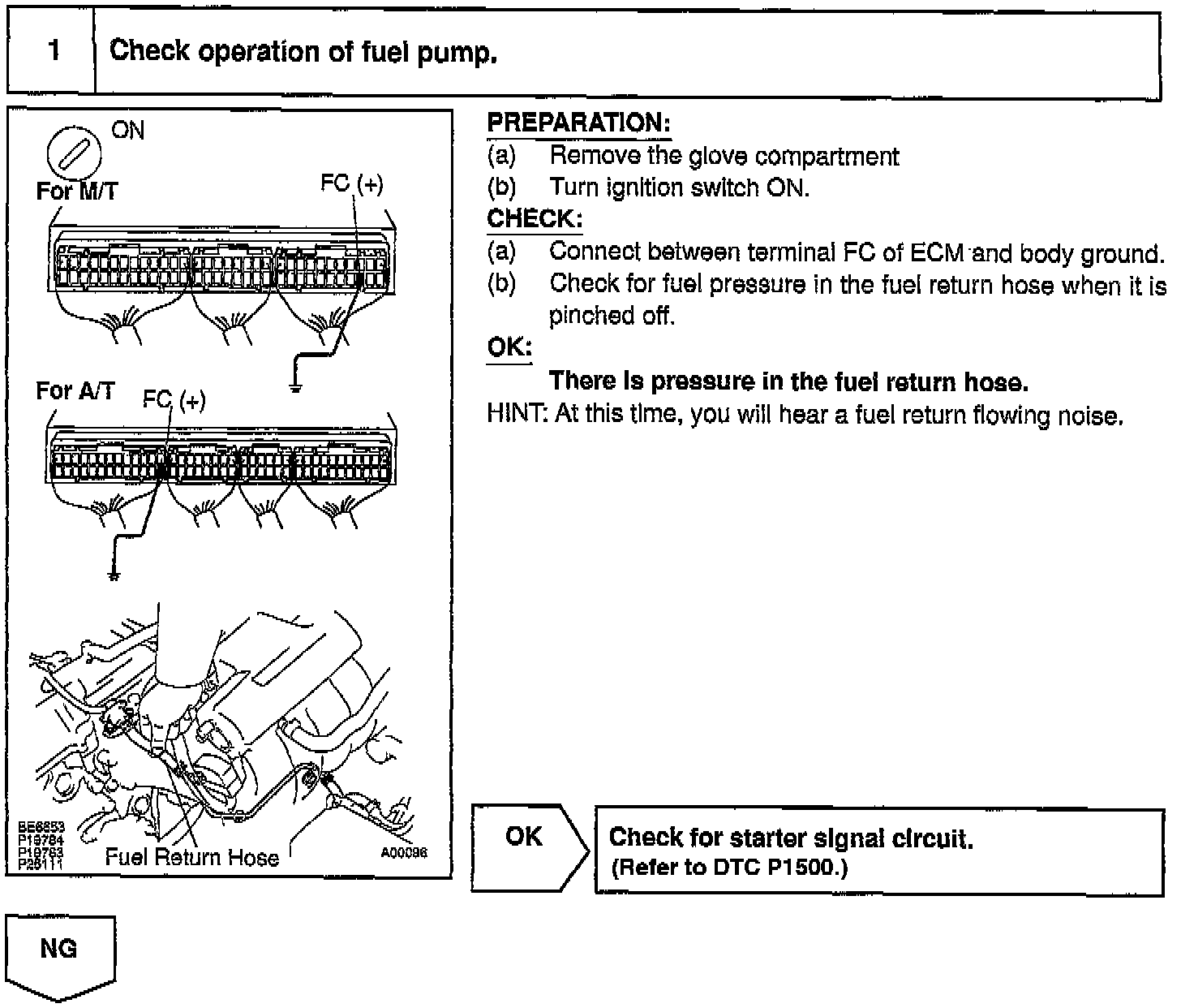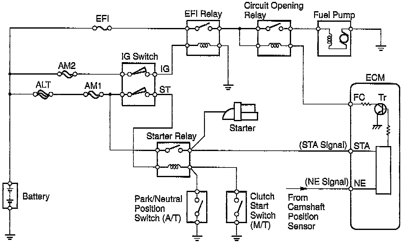 In the diagram above, when the engine is cranked, current flows from terminal ST of the ignition switch to the starter relay coil, the starter relay switches on and current flows to coil L1 of the circuit opening relay. Thus the circuit opening relay switches on, power is supplied to the fuel pump and the fuel pump operates. When the STA signal and NE signal are input to the ECM, Tr is turned ON, current flows to coil L2 of the circuit opening relay, the relay witches on and the fuel pump operates.