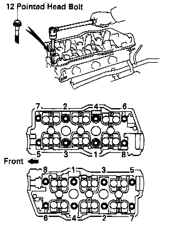 Uniformly loosen and remove the 8 cylinder head (12 pointed head) bolts on each cylinder head, in several passes, in the sequence shown, then repeat for the other side, as shown. Remove the 16 cylinder head bolts and plate washers.