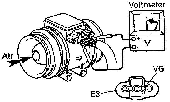 - Using a voltmeter, connect the positive (+) tester probe to terminal VG, and negative (-) tester probe to terminal E3.