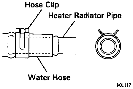 a. Push the water hose onto the heater radiator pipe as far as ridge on the pipe and install the hose clip.