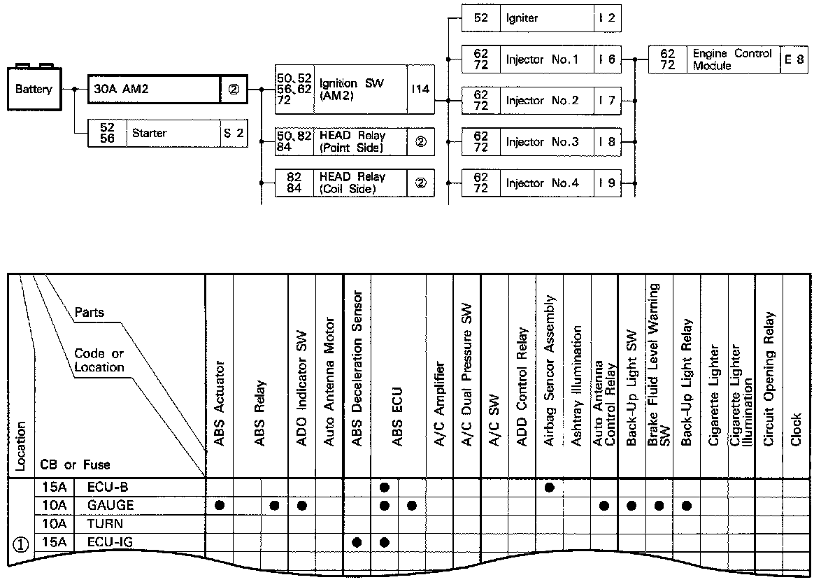 The chart shows the route by which current flows from the battery to each electrical source (Fusible Link, circuit Breaker, Fuse, etc.) and other parts.
