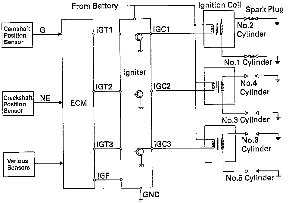 The ECM determines ignition timing and outputs the ignition signals (IGT) for each cylinder. Based on IGT signals, the igniter controls the primary ignition signals (IGC) for all ignition coils. At the same time, the igniter also sends and ignition confirmation signal (IGF) as a fail-safe measure to the ECM.