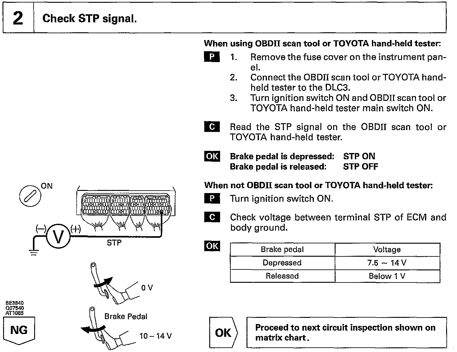 When the brake pedal is operated, this switch sends a signal to ECM. Then the ECM cancels operation of the lock-up clutch while braking is in progress.