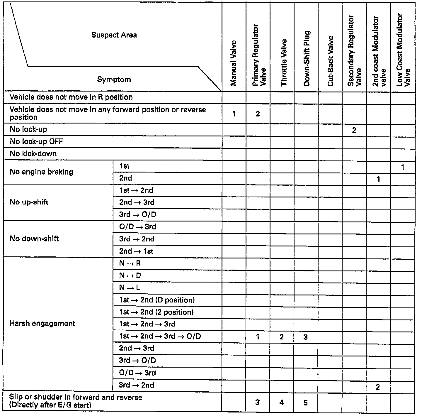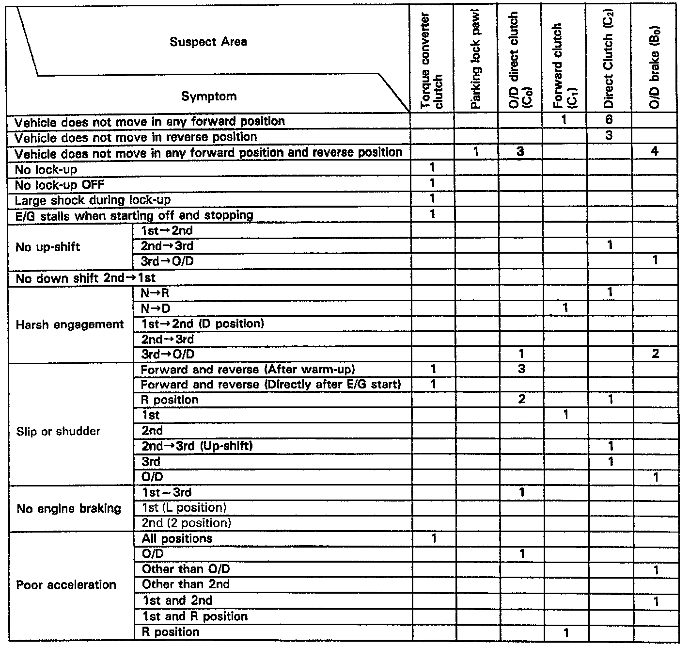 If a normal code is displayed during the DTC check but the trouble still occurs, check the circuits for each symptom in the order given in the following charts.The Matrix Chart is divided into 3 sections.