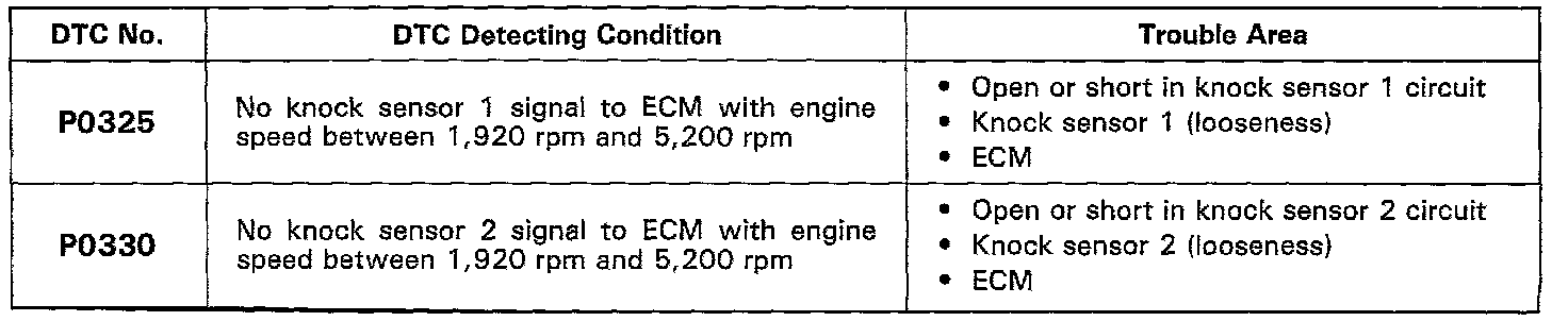 CIRCUIT DESCRIPTION Knock sensors are fitted one each to the front and rear of the left side of the cylinder block to detect engine knocking This sensor contains a piezoelectric element which generates a voltage when it becomes deformed, which occurs when the cylinder block vibrates due to knocking. If engine knocking occurs, ignition timing is retarded to suppress it.