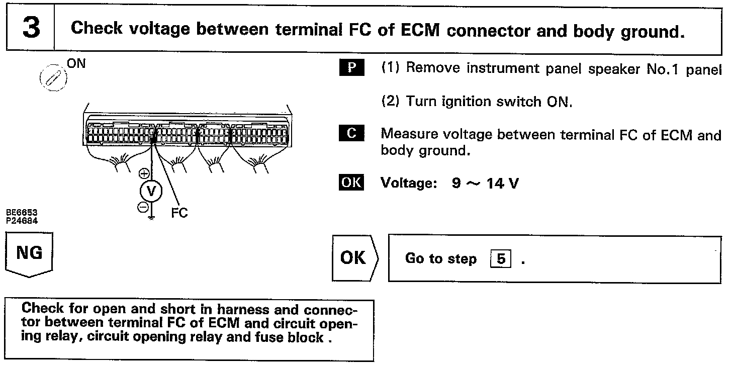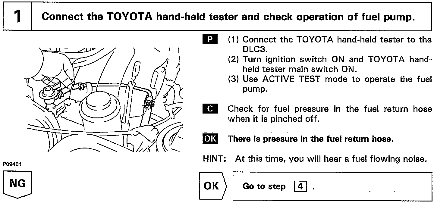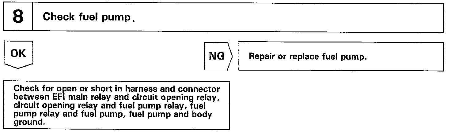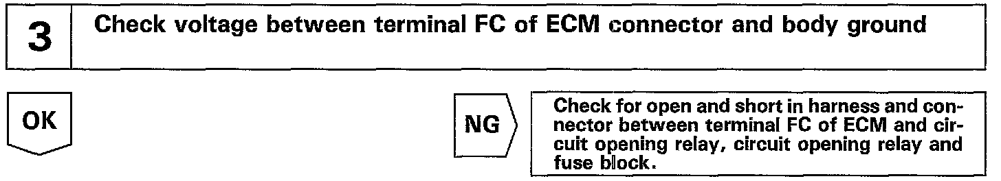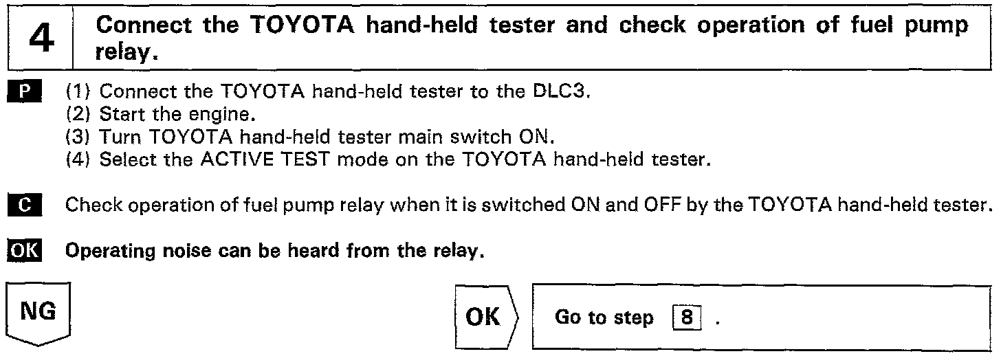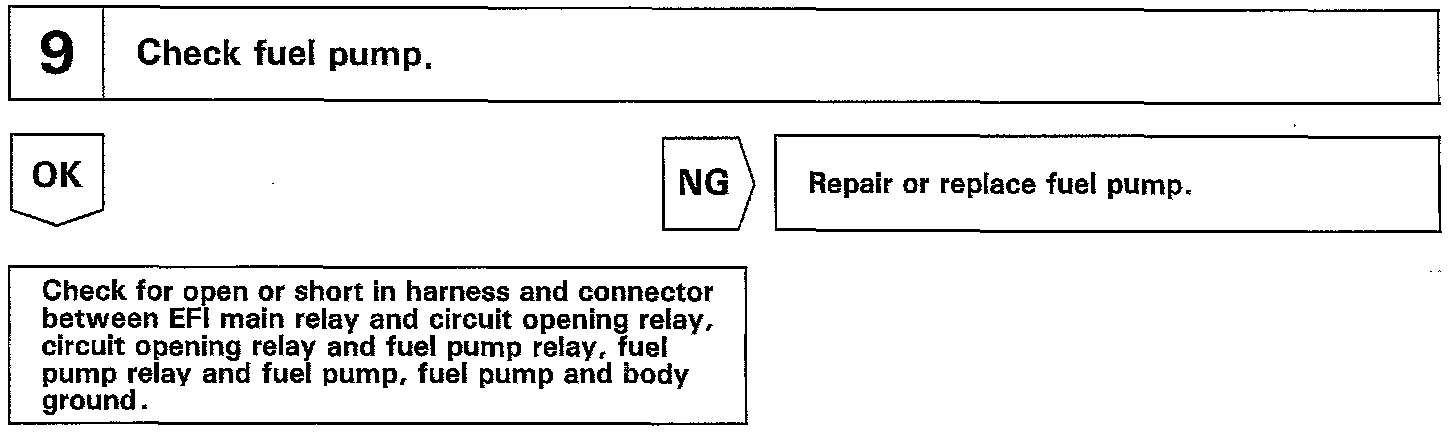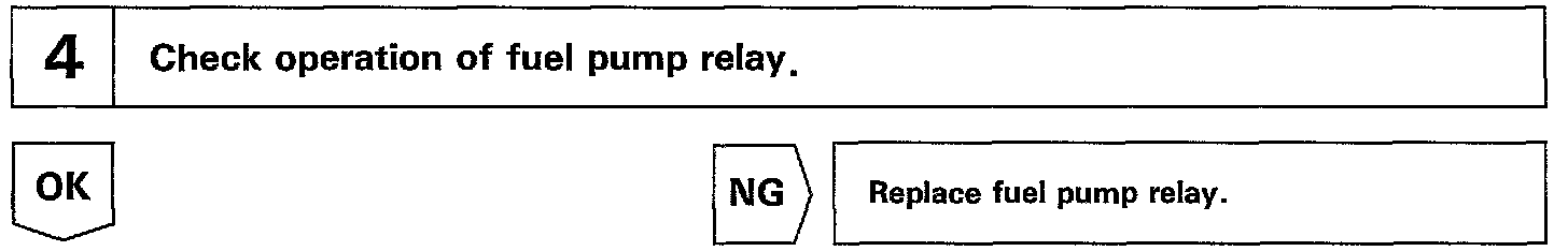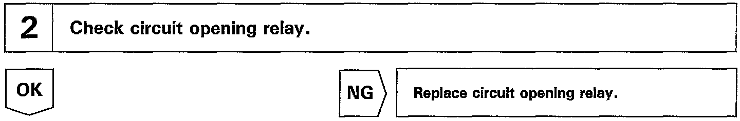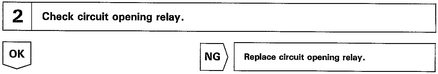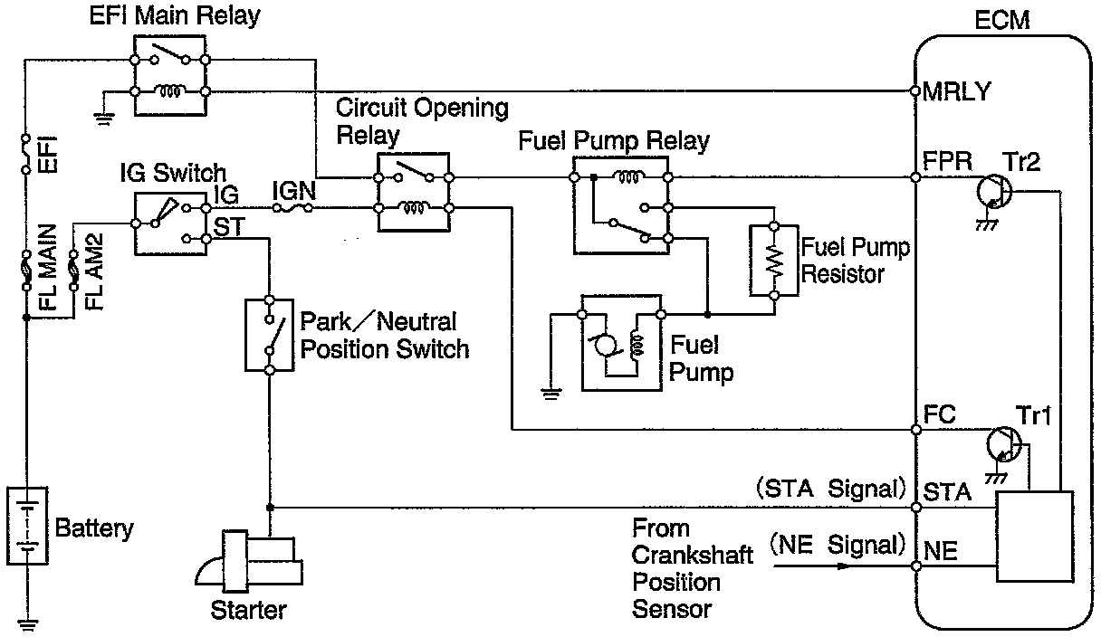 When the STA signal and NE signal are input to the ECM, Tr1 is turned ON, current flows to coil of the circuit opening relay, the relay switches on, power is supplied to the fuel pump and the fuel pump operates While the NE signal is generated (engine running), the ECM keeps Tr1 ON (circuit opening relay ON) and the fuel pump also keeps operating.