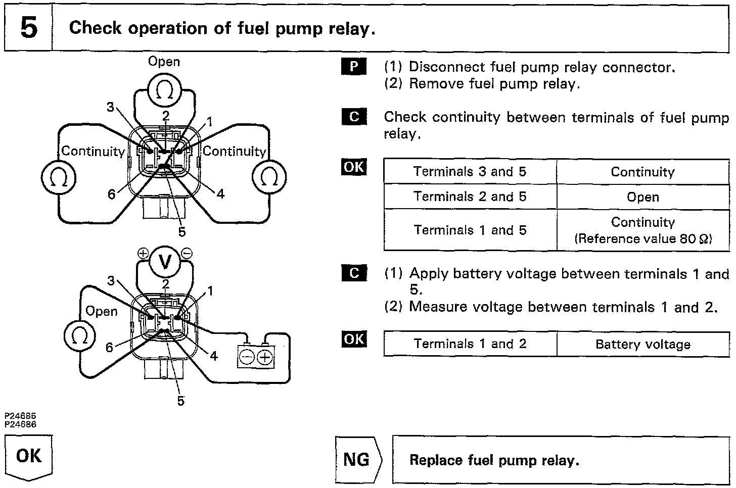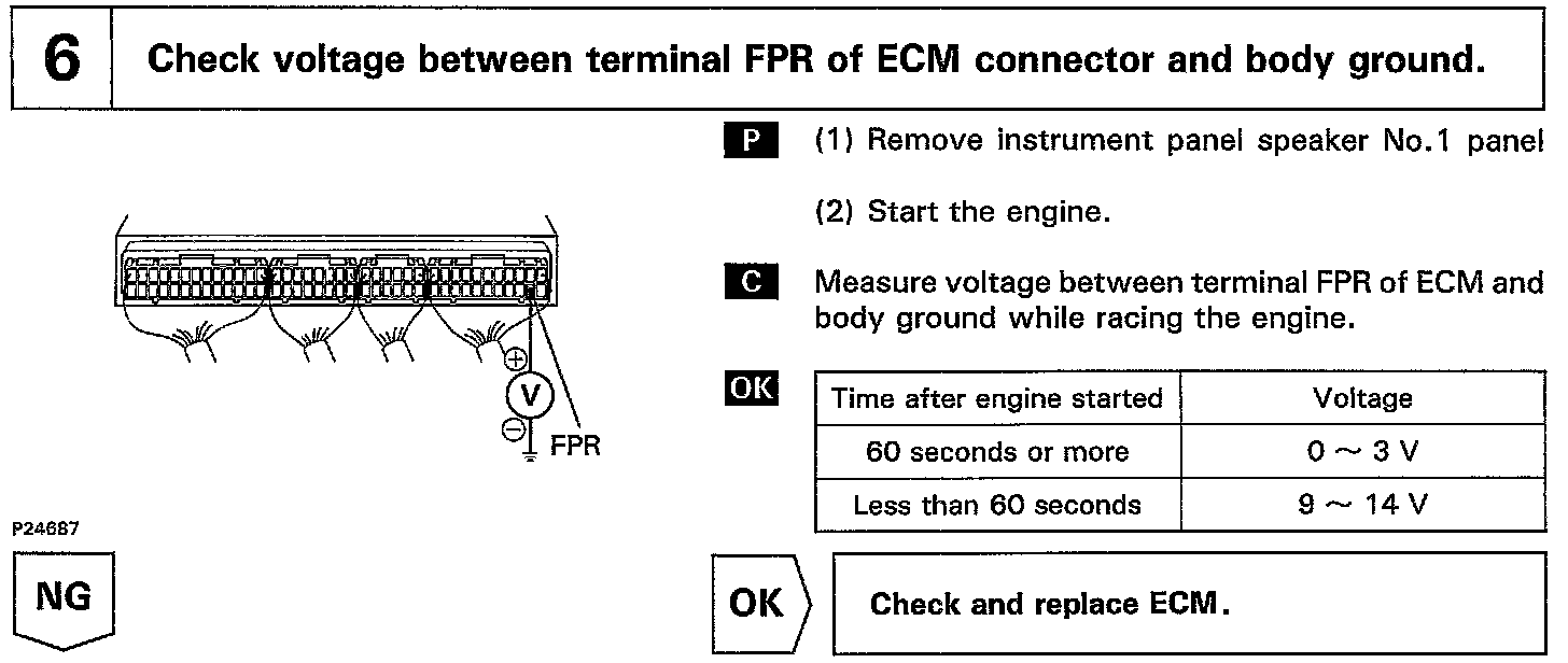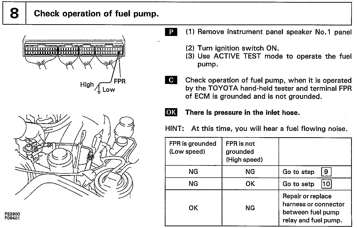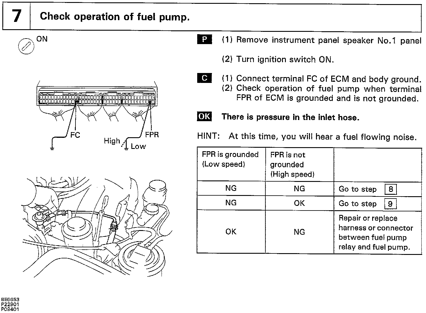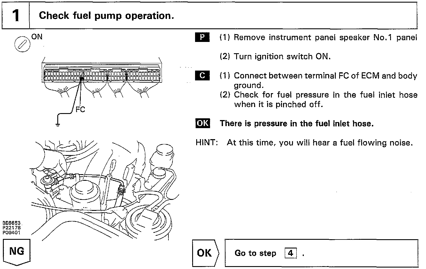 When the STA signal and NE signal are input to the ECM, Tr1 is turned ON, current flows to coil of the circuit opening relay, the relay switches on, power is supplied to the fuel pump and the fuel pump operates While the NE signal is generated (engine running), the ECM keeps Tr1 ON (circuit opening relay ON) and the fuel pump also keeps operating.