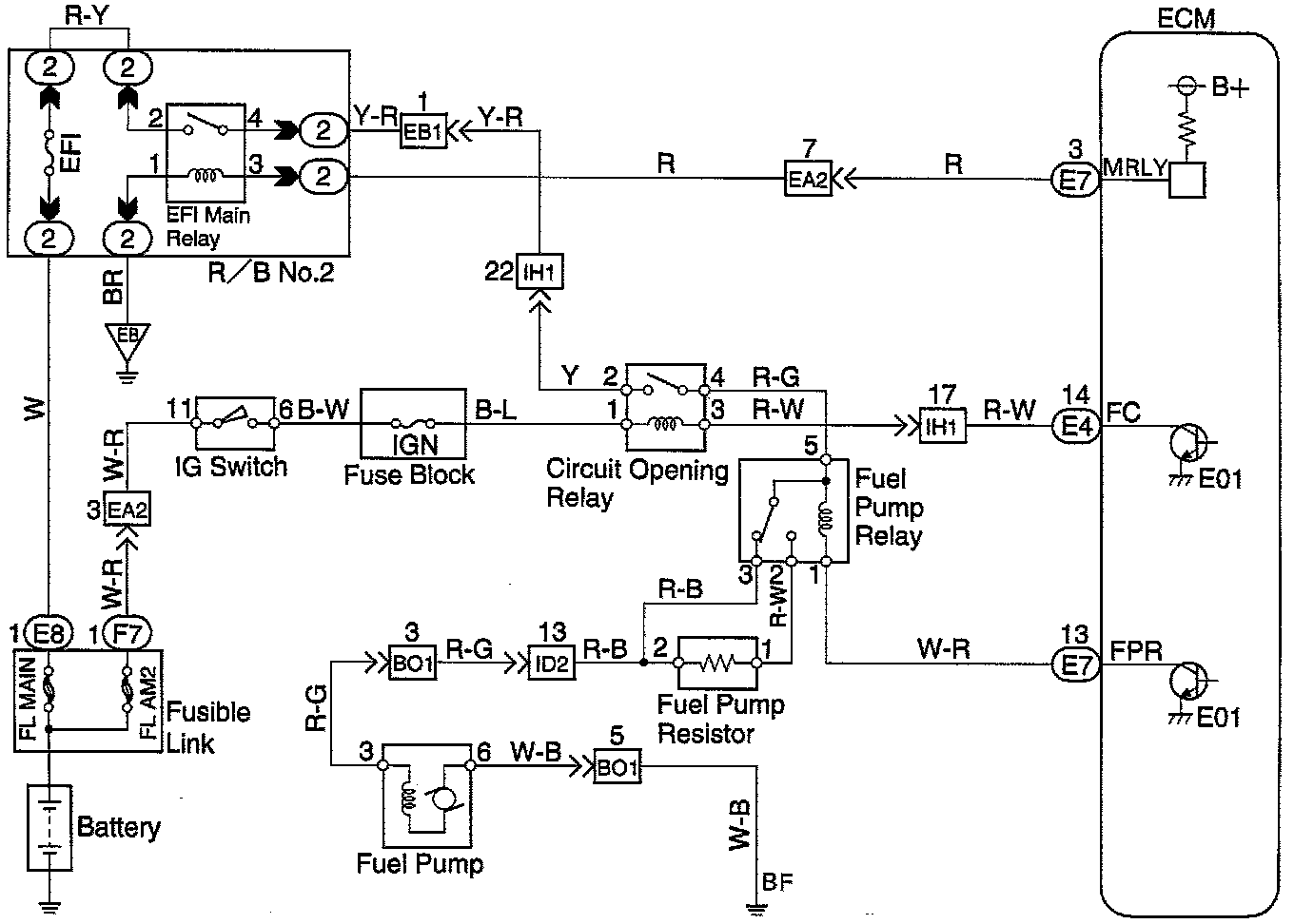After the engine starts, during idling or light loads, since Tr2 goes ON, power is supplied to the fuel pump via the fuel pump resistor.