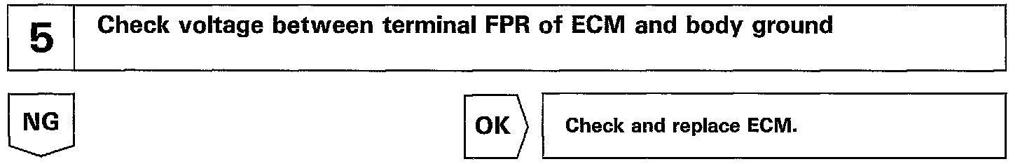 The fuel pump speed is controlled at two levels (high speed or low speed) by the condition of the engine (starting, light load, heavy load). When the engine starts (STA ON), Tr2 in the ECM is OFF, so battery voltage is applied directly to the fuel pump. Fuel pump operates at high speed.