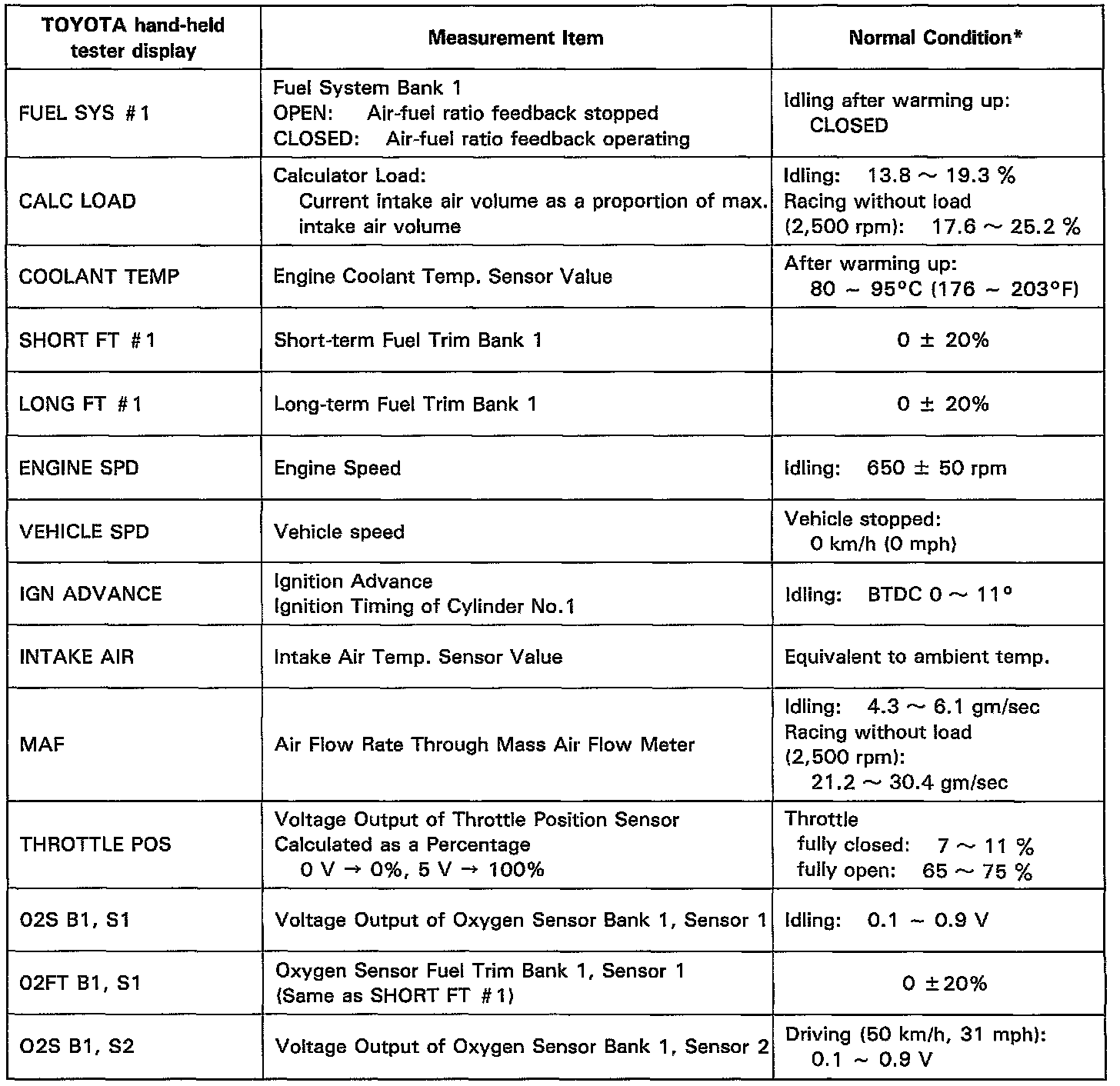NOTICE: The values given below for "Normal Condition" are representative values, so a vehicle may still be normal even if its value varies from those listed here. So do not decide whether a part is faulty or not solely according to the "Normal Condition" here.