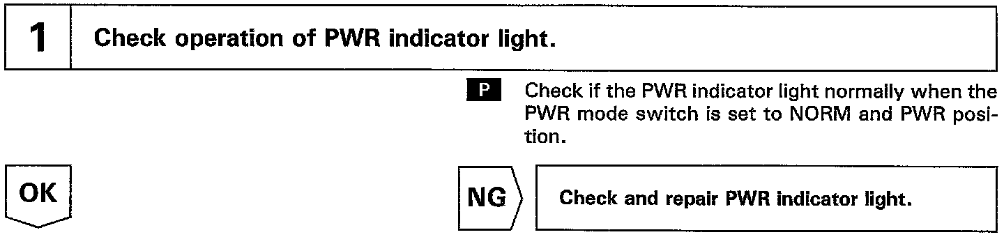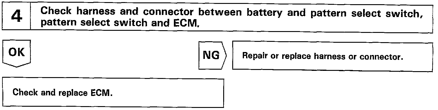 The ECM memory contains the shift programs for the NORMAL and POWER patterns, 2 position, and L position and the lock-up patterns. Following the programs corresponding to the signals from the pattern select switch, the park/neutral position switch and other various sensors, the ECM switches the solenoid valves ON and OFF, and control the transmission gear change and the lock-up clutch operation.