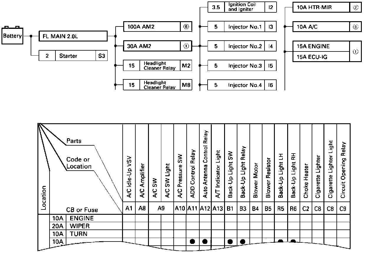 The chart shows the route by which current flows from the battery to each electrical source (Fusible Link, circuit Breaker, Fuse, etc.) and other parts.