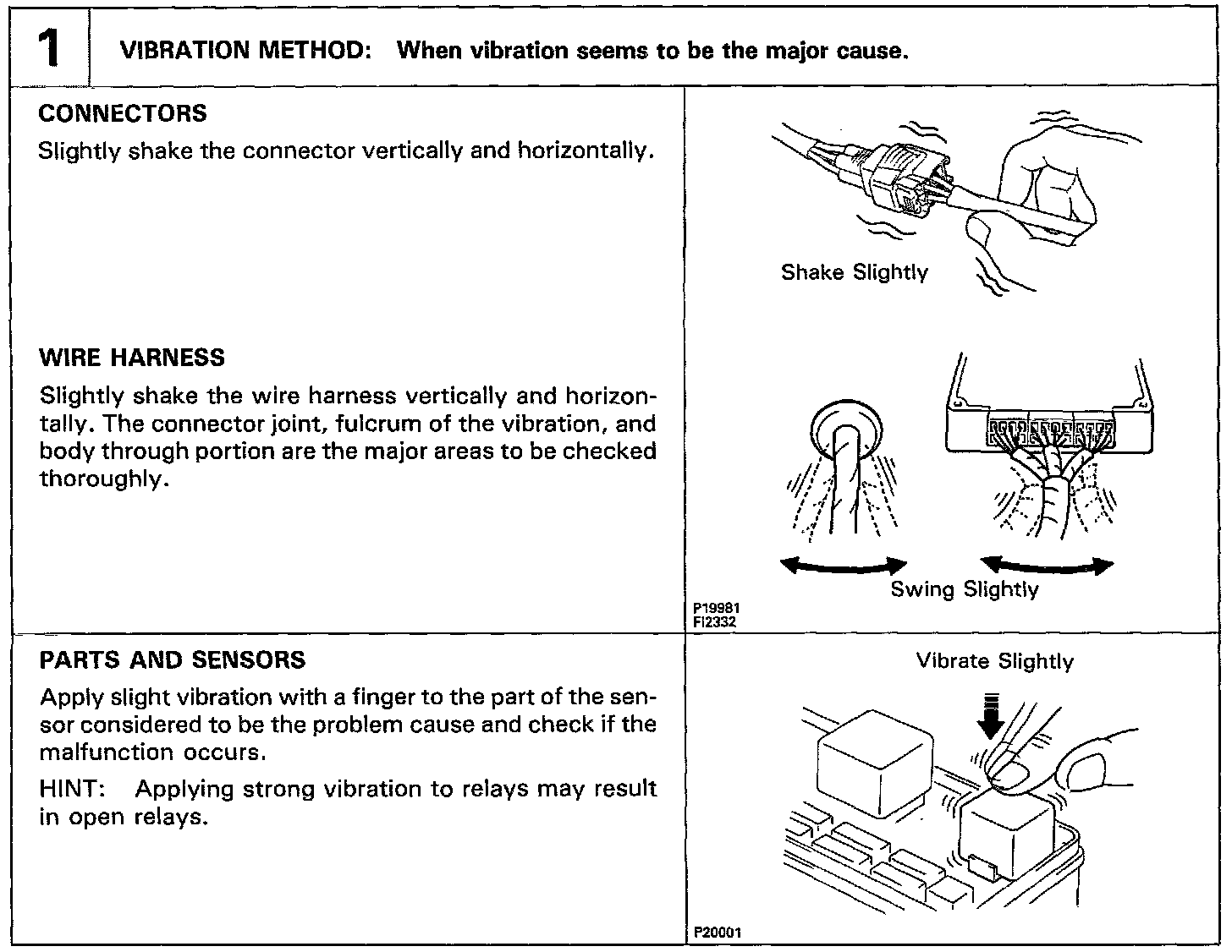 The most difficult case in troubleshooting is when there are no problem symptoms occurring. In such cases, a thorough customer problem analysis must be carried out, then simulate the same or similar conditions and environment in which the problem occurred in the customer's vehicle. No matter how much experience a technician has, or how skilled he may be, if he proceeds to troubleshoot without confirming the problem symptoms he will tend to overlook something important in the repair operation and make a wrong guess somewhere, which will only lead to a standstill. For example, for a problem which only occurs when the engine is cold, or for a problem which occurs due to vibration caused by the road during driving, etc., the problem can never be determined so long as the symptoms are confirmed with the engine hot condition or the vehicle at a standstill. Since vibration, heat or water penetration (moisture) are likely causes for problems which are difficult to reproduce, the symptom simulation tests introduced here are effective measures in that the external causes are applied to the vehicle in a stopped condition.