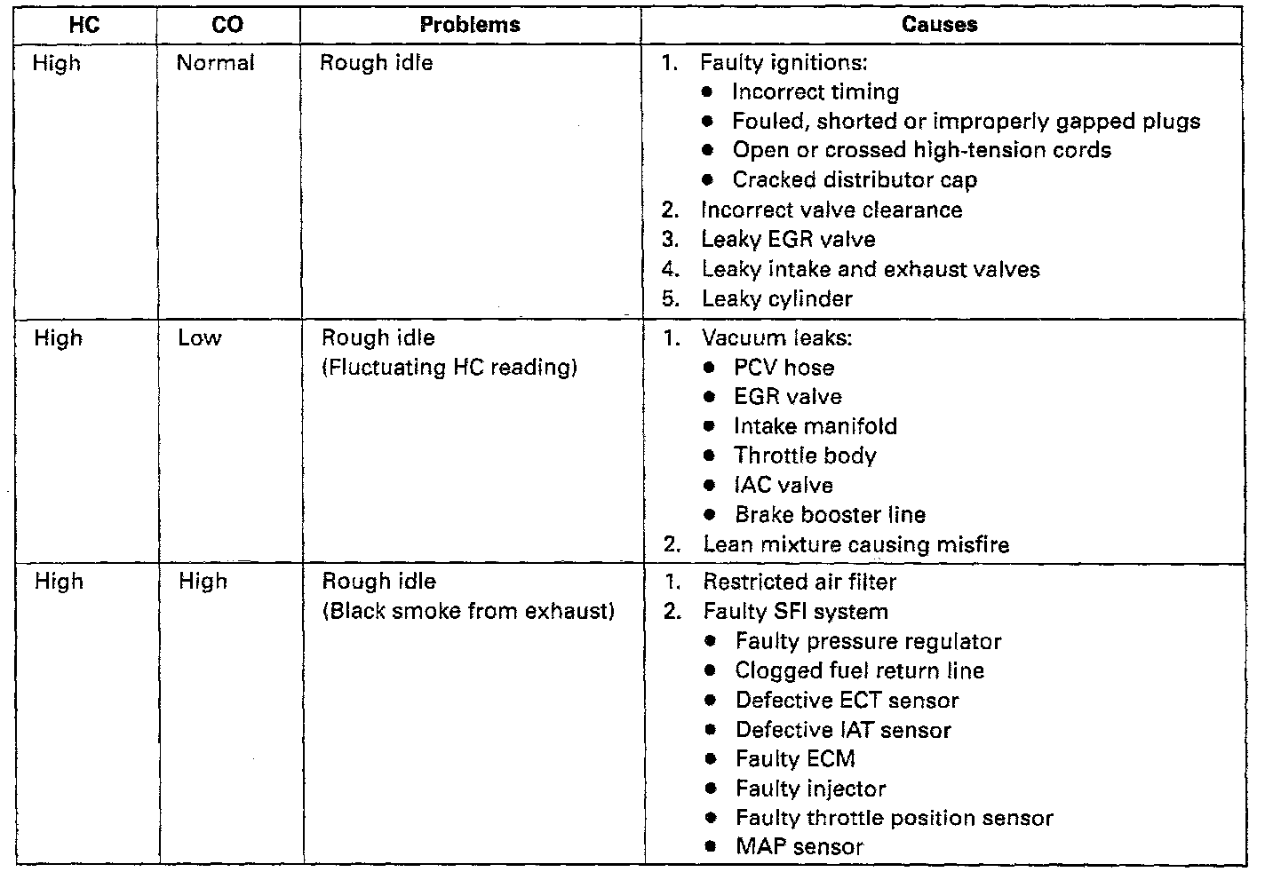 If the CO/HC concentration does not comply with regulations, perform troubleshooting in the order given above. Check oxygen sensor operation. See the table for possible causes, then inspect and correct the applicable causes if necessary.