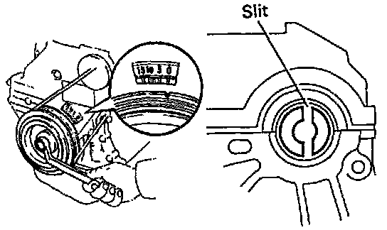 - Turn the crankshaft clockwise, and position the slit of the intake camshaft as shown in the illustration.