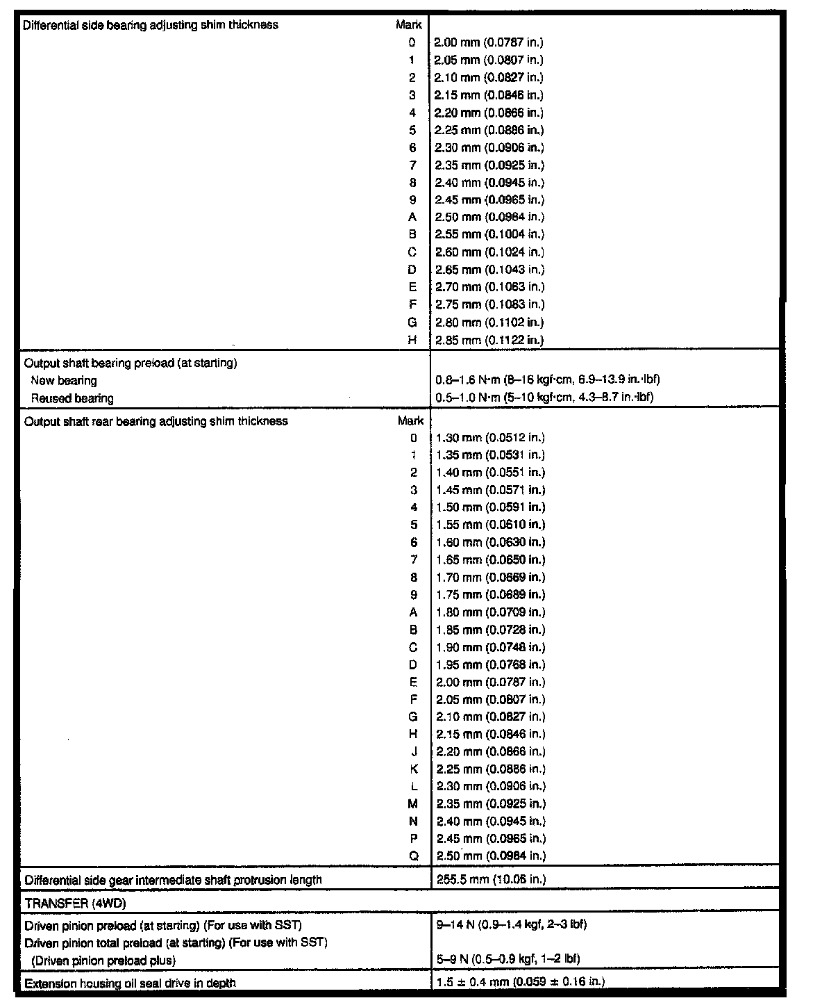 5-spd M/T, Pinion Bearing/Ring Gear Thickness: